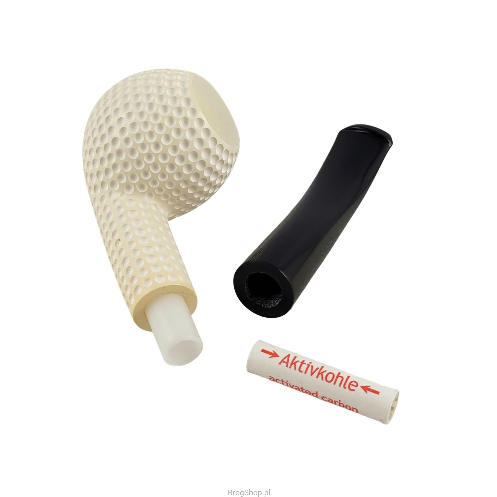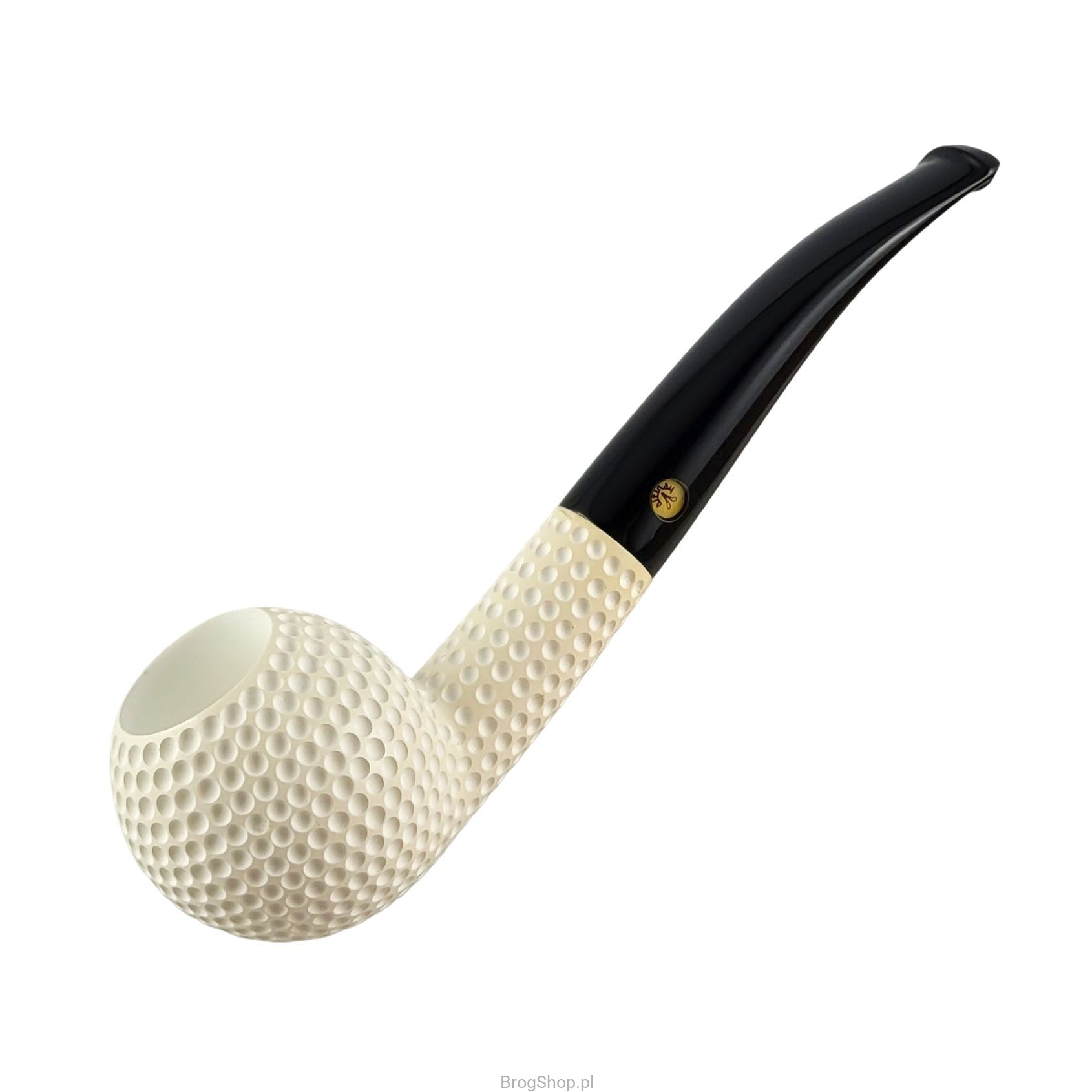 Traditional Turkish tobacco pipe, hand-decorated and made of real sepiolite block (sea foam) - the maker Nedim Altinay. A pleasant bent in an enlarged version with a characteristic carving called "Golf" by the author. Acrylic stem with the company's logo and space for replaceable 9 mm absorbent filters. The pipe impresses with its precision workmanship, but its greatest advantages will be felt only while smoking. Without a doubt, Altinay products are an example of applied art. The mouthpiece's spigot is permanently fixed in the shank, such a solution eliminates excessive stress, arising during frequent mounting and dismounting of the mouthpiece, thus prolonging the life of both elements. The price includes the pipe and a dedicated case. Available one piece shown in the photos.