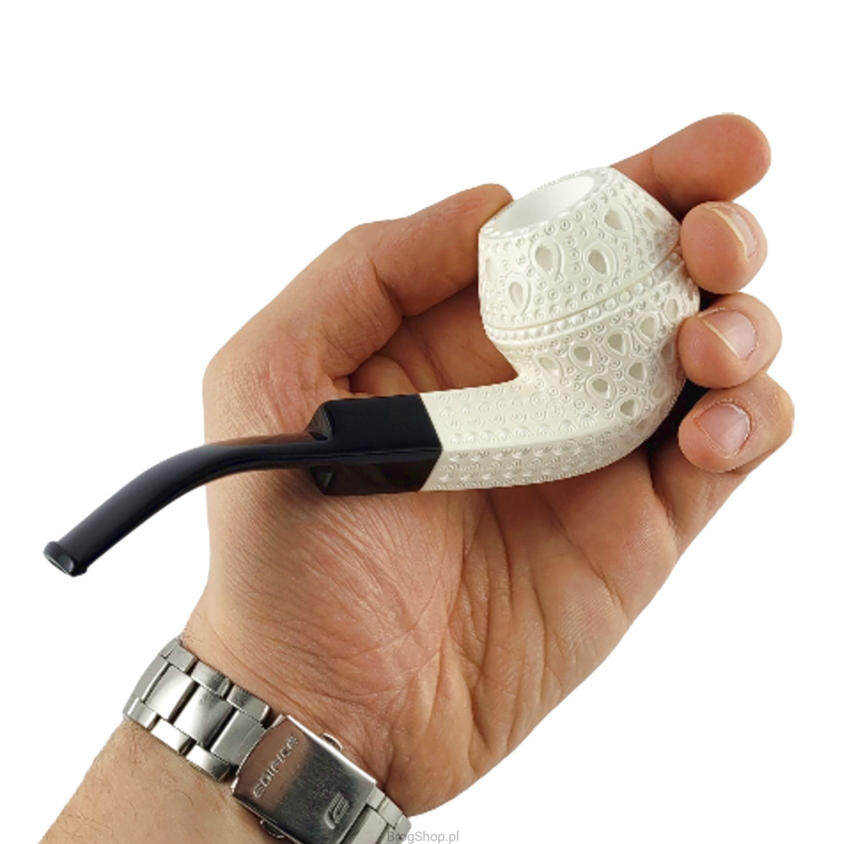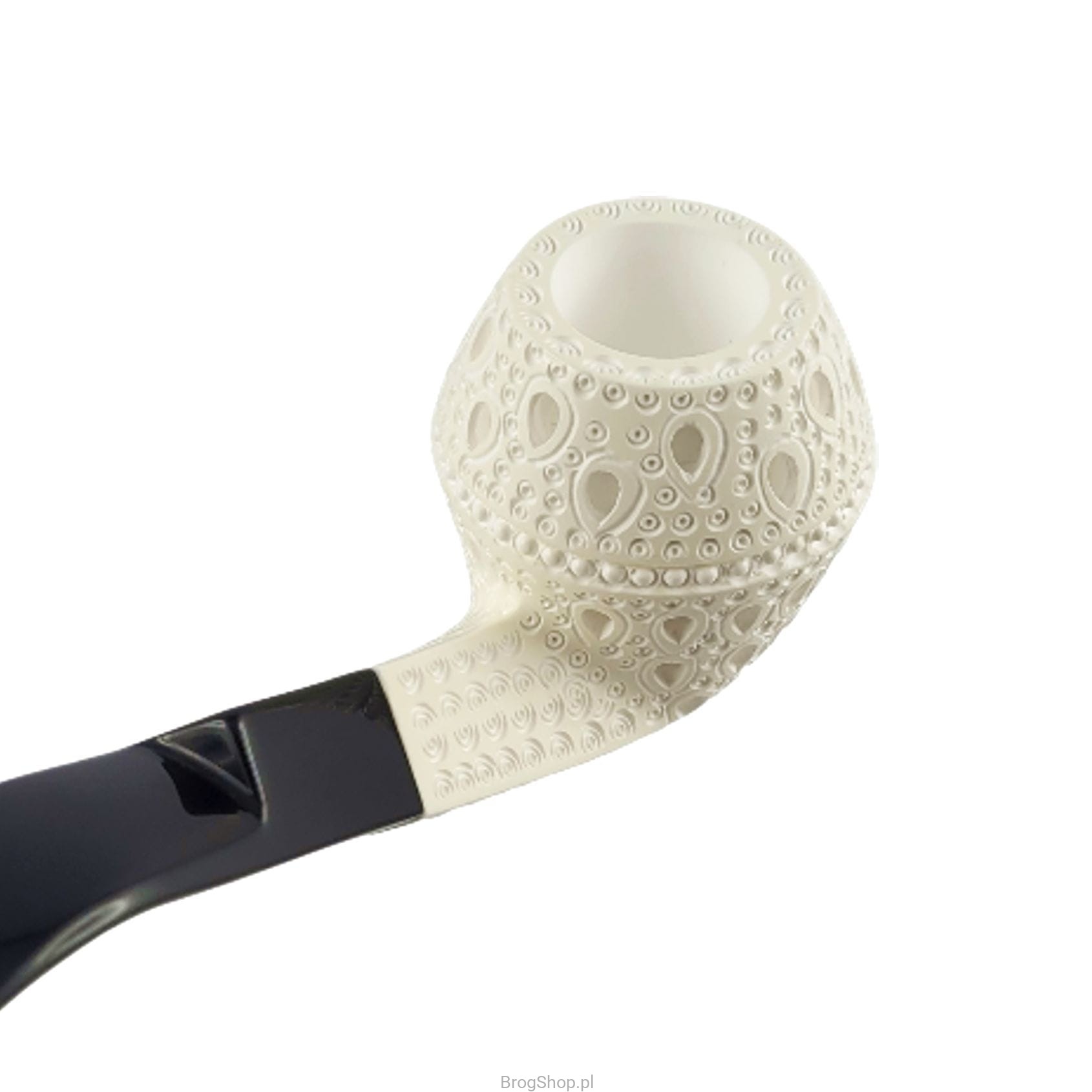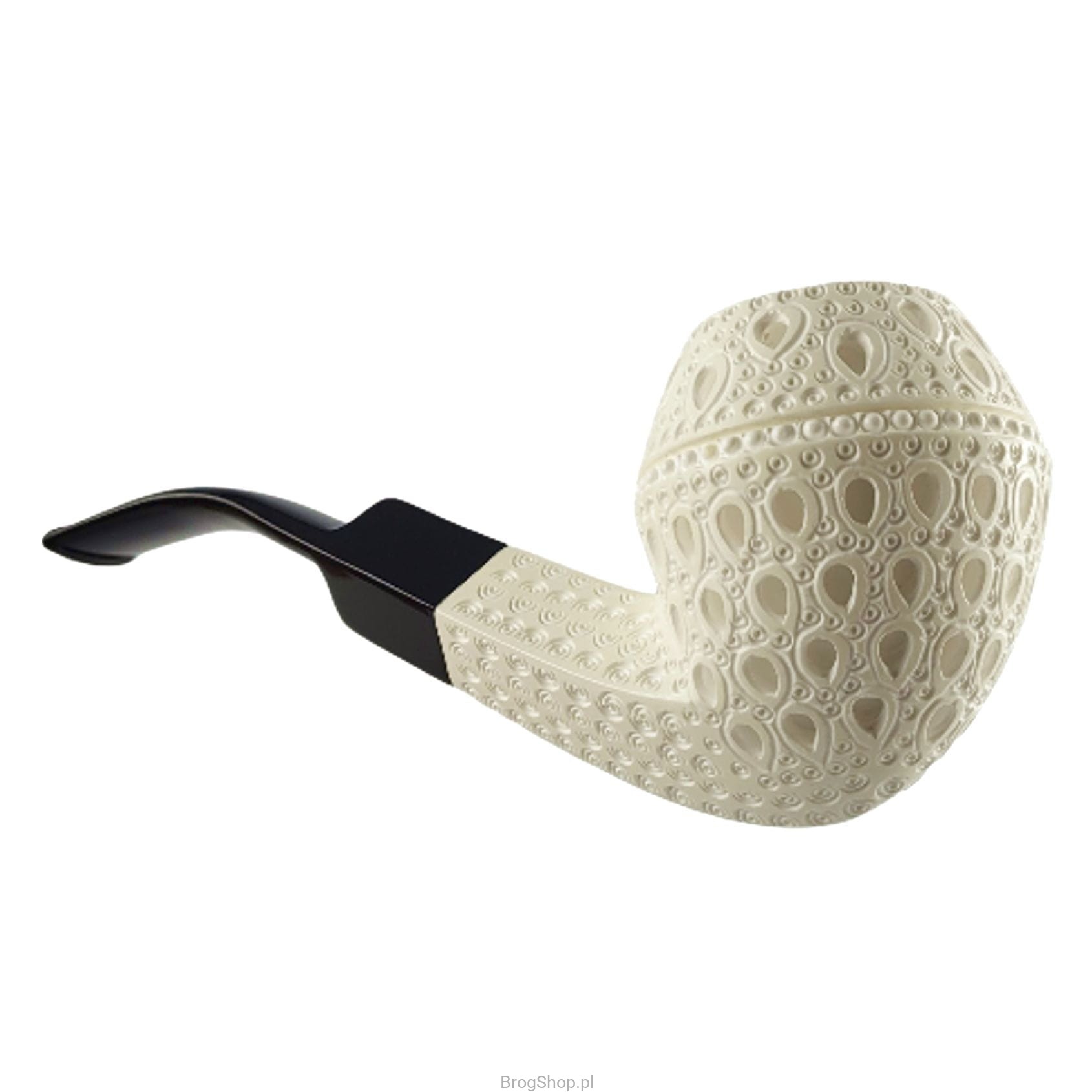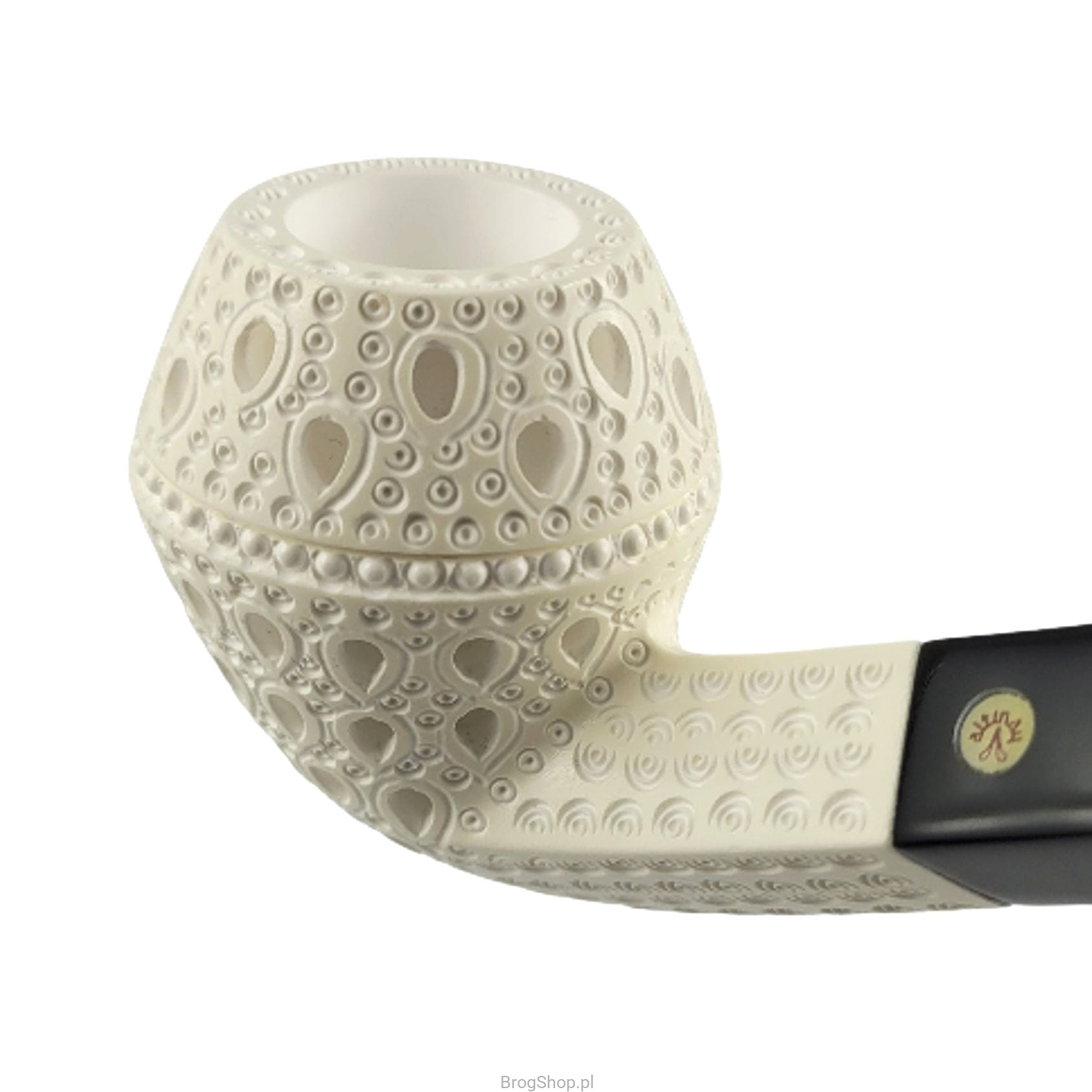 Turkish smoking pipe, handcrafted and carved from a block of sea foam (sepiolite) by Nedim Altinay. Enlarged version of the Bent Bulldog with a characteristic decoration and an acrylic stem. The pipe delights with the amount of details and precision of workmanship, it is undoubtedly a unique example of a pipe as an object for smoking.