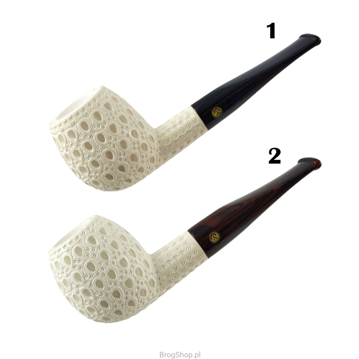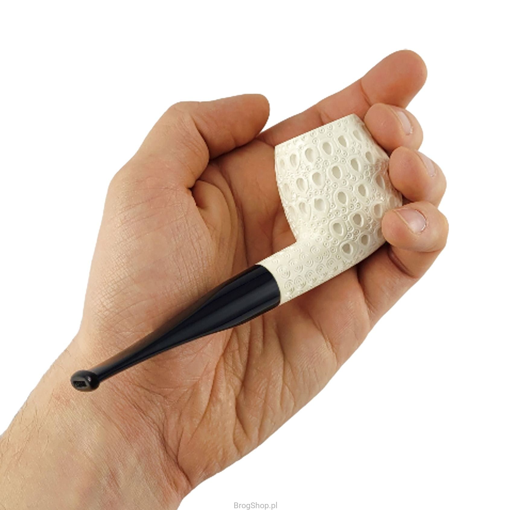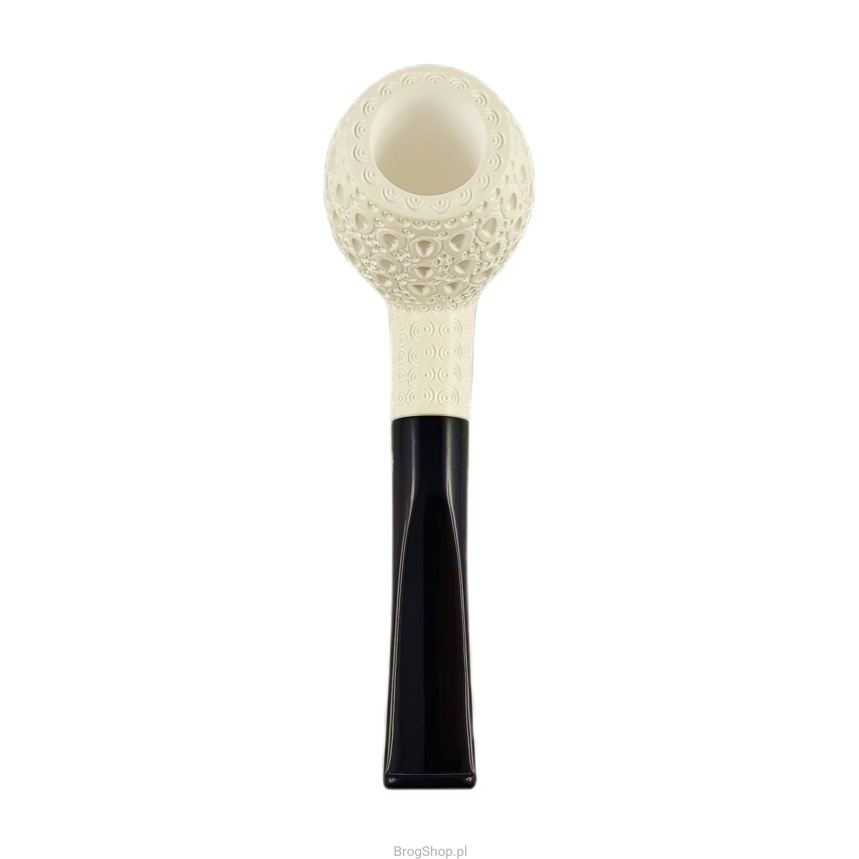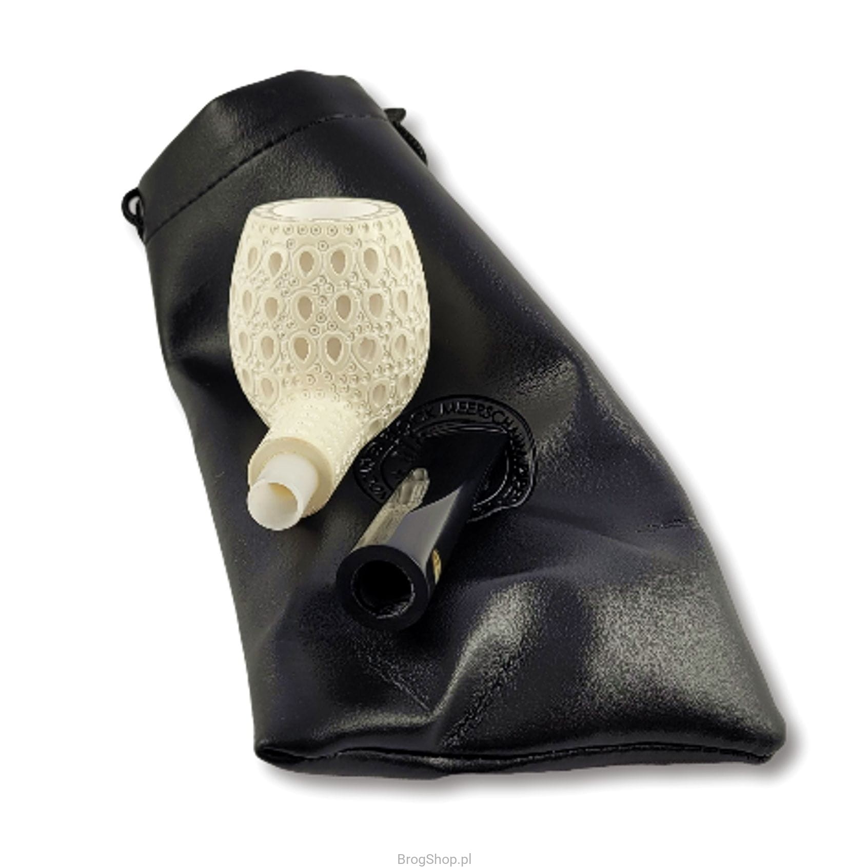 Turkish smoking pipe, handcrafted and carved from a block of sea foam (sepiolite) by Nedim Altinay. Apple in an enlarged version with a characteristic ornament and an acrylic stem in black or brown to choose from. The pipe delights with the amount of details and precision of workmanship, it is undoubtedly a unique example of a pipe as an object for smoking.