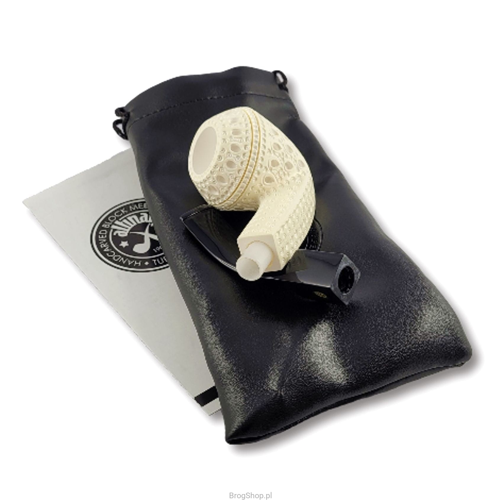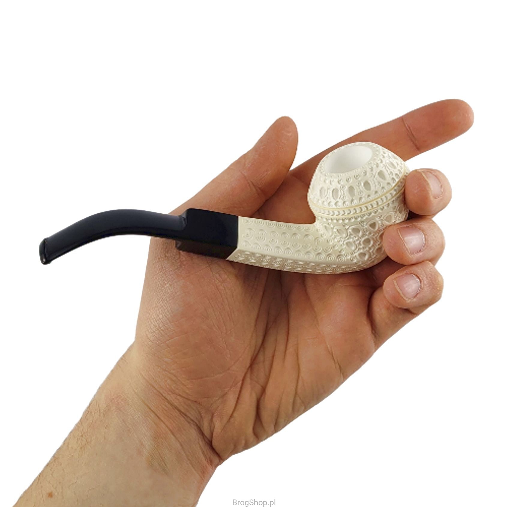 Turkish smoking pipe, handcrafted and carved from a block of sea foam (sepiolite) by Nedim Altinay. Enlarged version of the Bent Bulldog with a characteristic decoration and an acrylic stem. The pipe delights with the amount of details and precision of workmanship, it is undoubtedly a unique example of a pipe as an object for smoking.