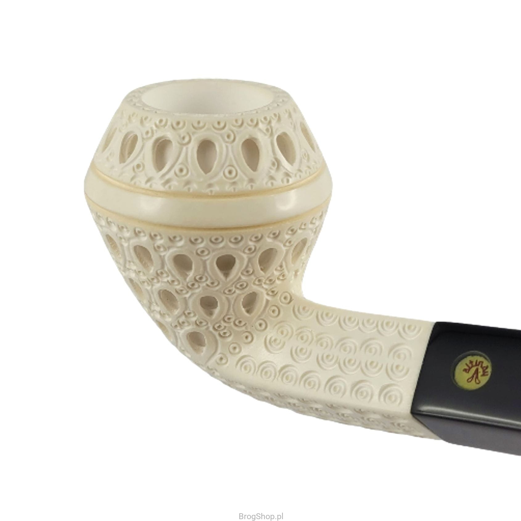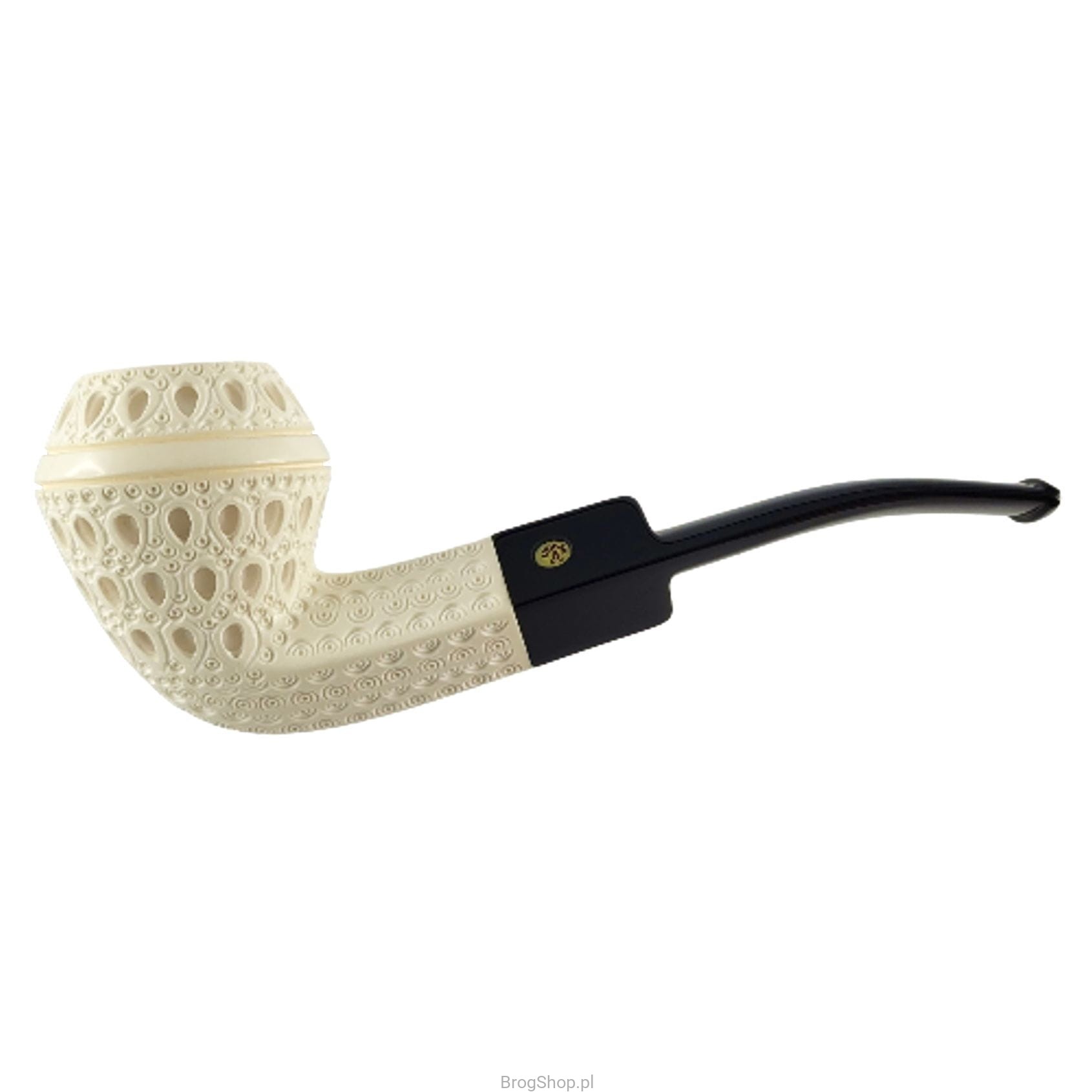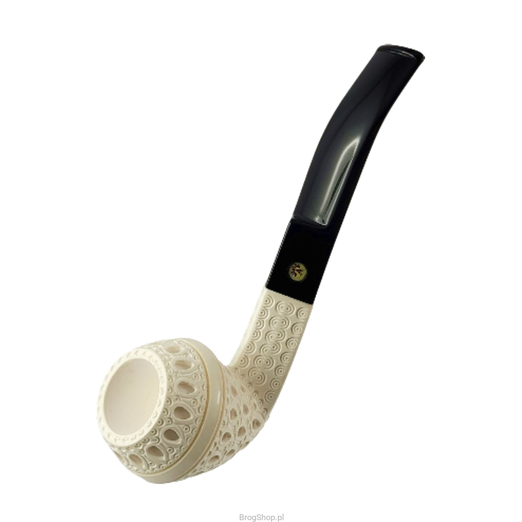 Turkish smoking pipe, handcrafted and carved from a block of sea foam (sepiolite) by Nedim Altinay. Enlarged version of the Bent Bulldog with a characteristic decoration and an acrylic stem. The pipe delights with the amount of details and precision of workmanship, it is undoubtedly a unique example of a pipe as an object for smoking.