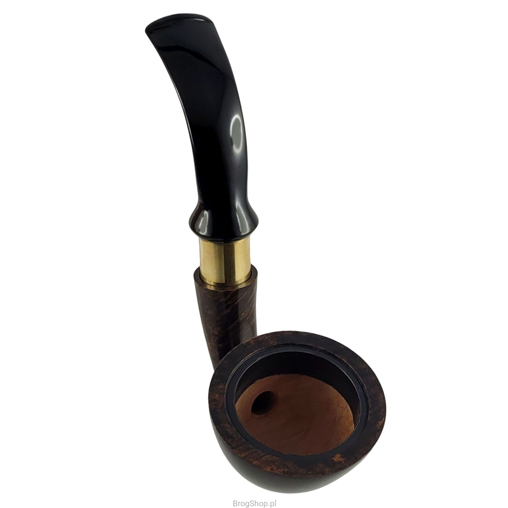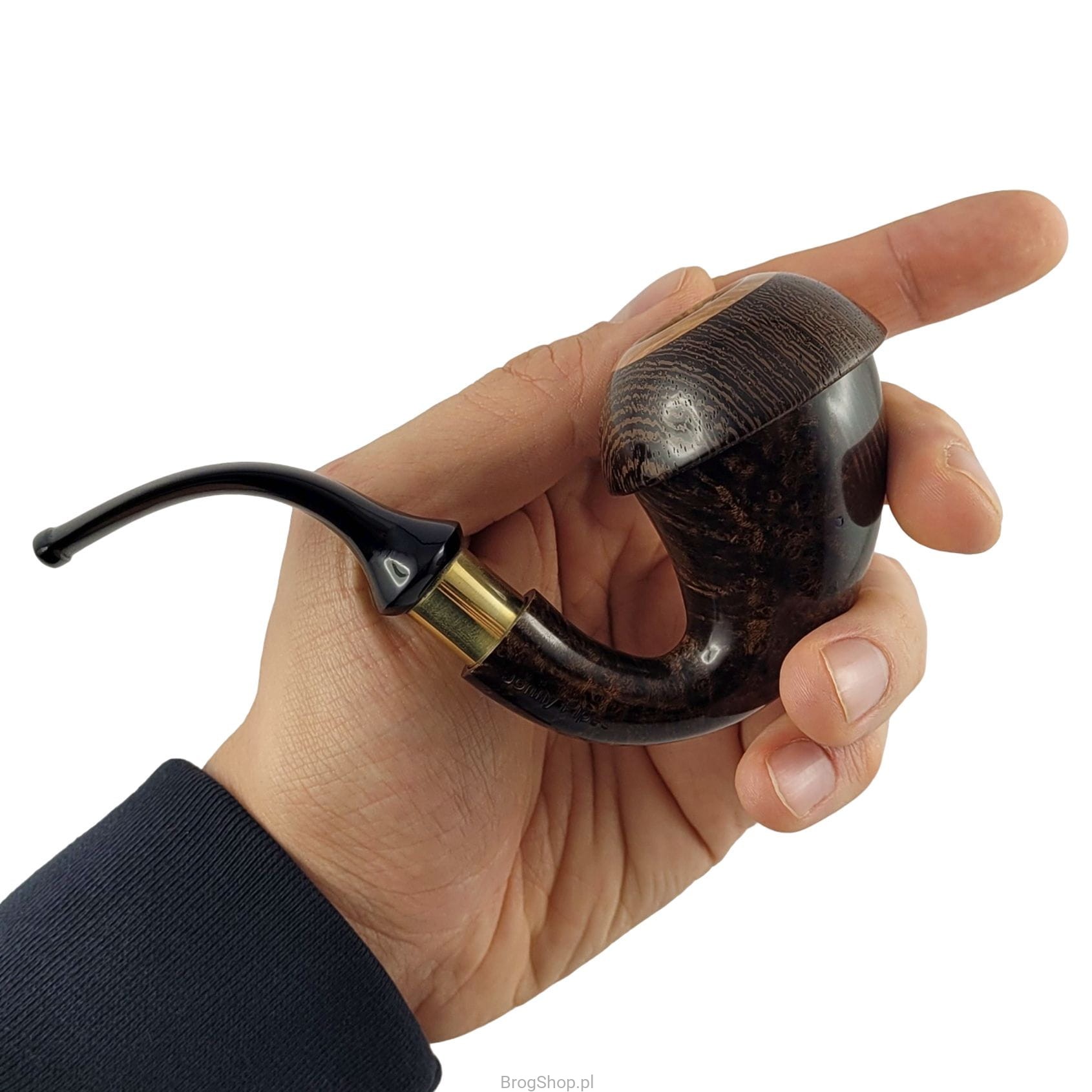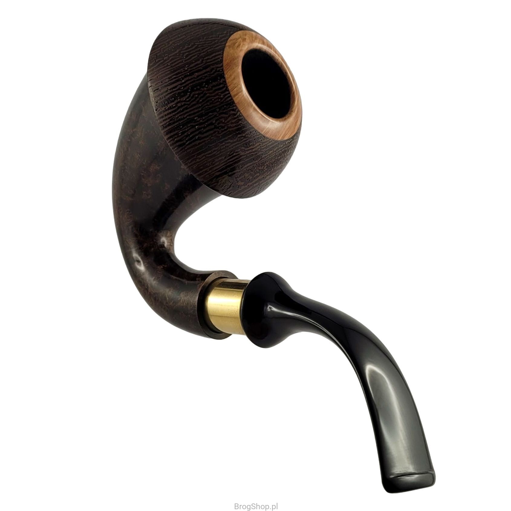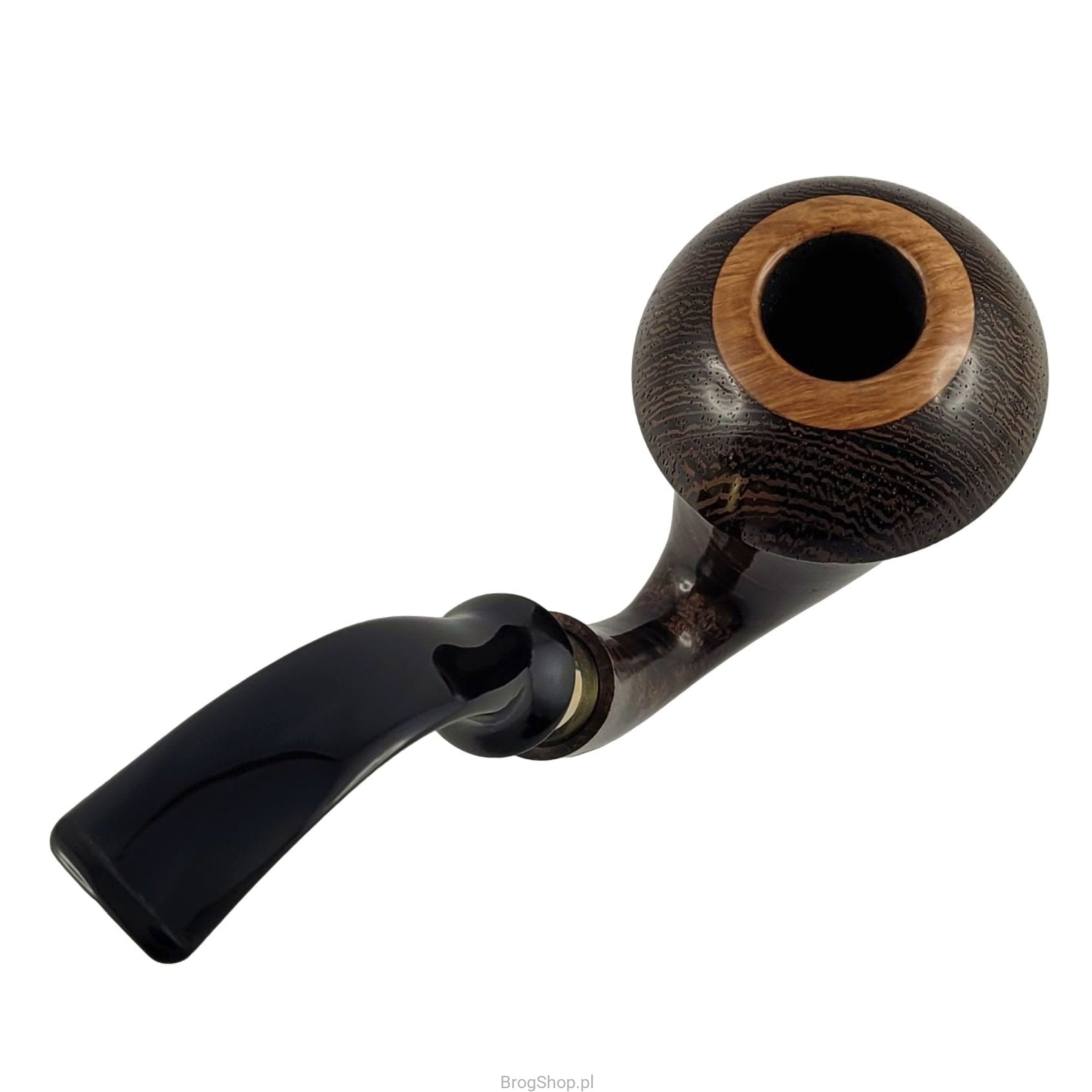 Traditional Calabash pipes have a body made of calabash, Johny Pipes designed and handcrafted a pipe that has a body made of briar. The headstock is made of exotic Wenge wood, while the tobacco furnace is made of briar. The body has a delrin gasket, on which the headstock with furnace is set. The acrylic mouthpiece without a filter has a wide brass ring and is pivotally embedded in a derlin sleeve, located in the shank socket, which increases the strength of the whole. Impressive appearance and precise workmanship are undoubtedly the main advantages of this unusual pipe. The large chamber under the furnace is a guarantee of sweet and dry smoke without the need for filters. Wax with a distinct grain, stained in a dark brown color, protected with Danish oil and wax. Precarbonized furnace, cover and manufacturer's box included in the price. Recommended as an interesting addition to the collection or a sophisticated and uncommon gift in Europe.