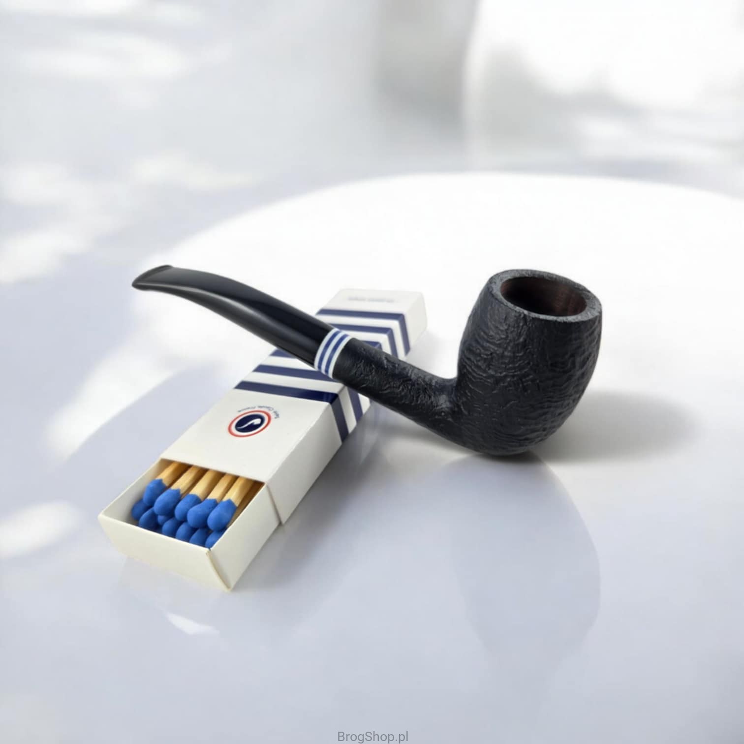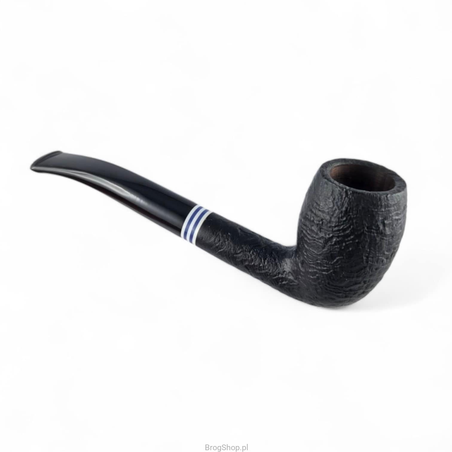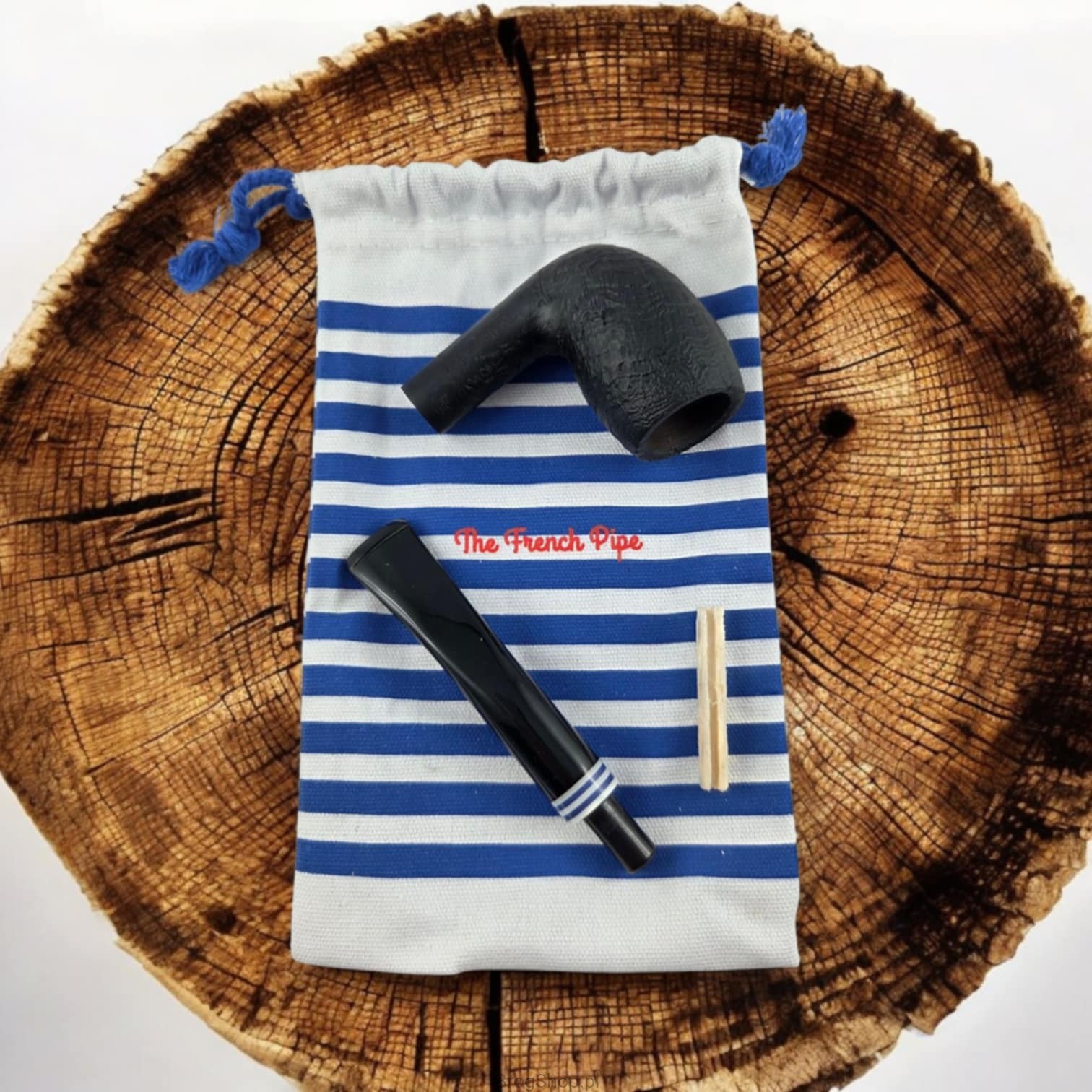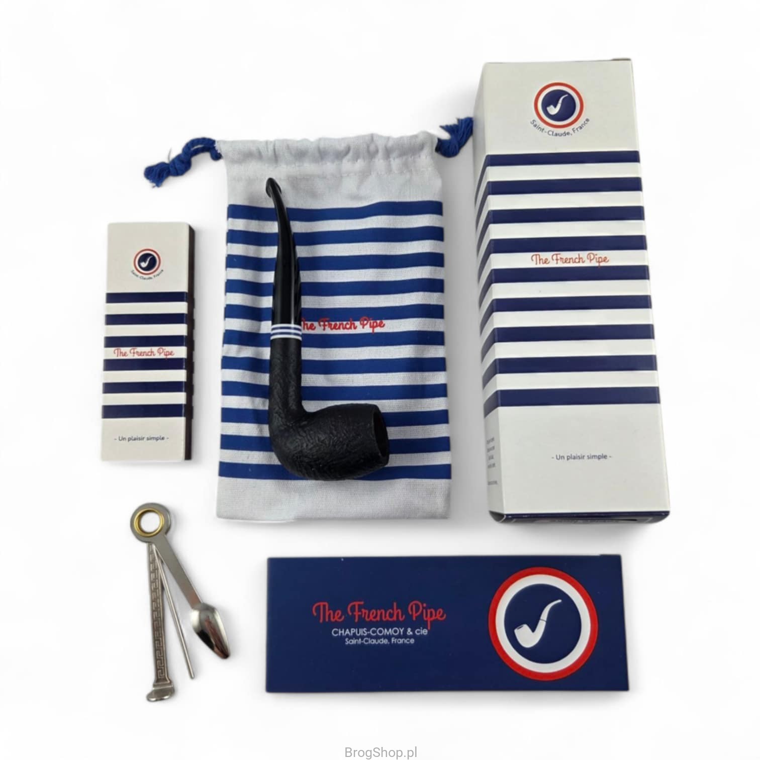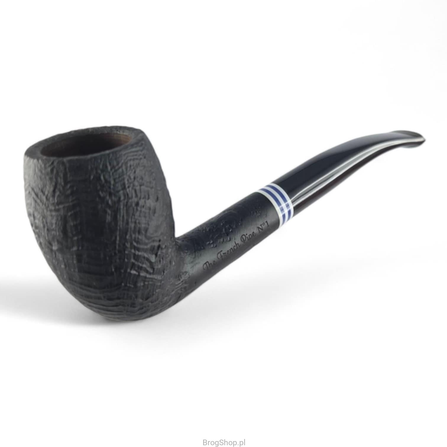 The French Pipe No. 1 Sablée Noir is a handcrafted briar pipe in a classic shape. Finished in deep black with a sandblasted bowl and a contrasting blue-and-white ring, it evokes the timeless “marinière” pattern — an emblem of French elegance. This motif is also featured on the fabric pouch, the box, and the included long matches.