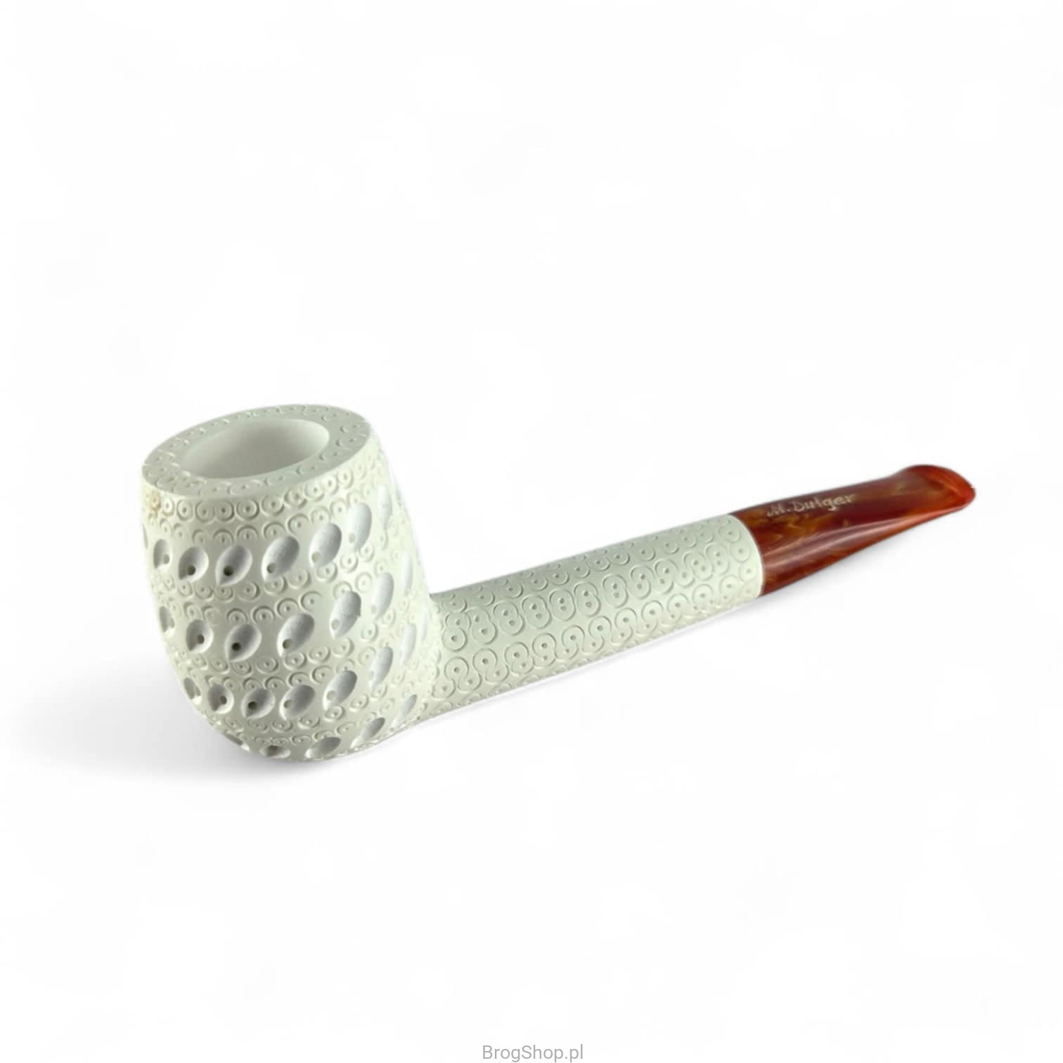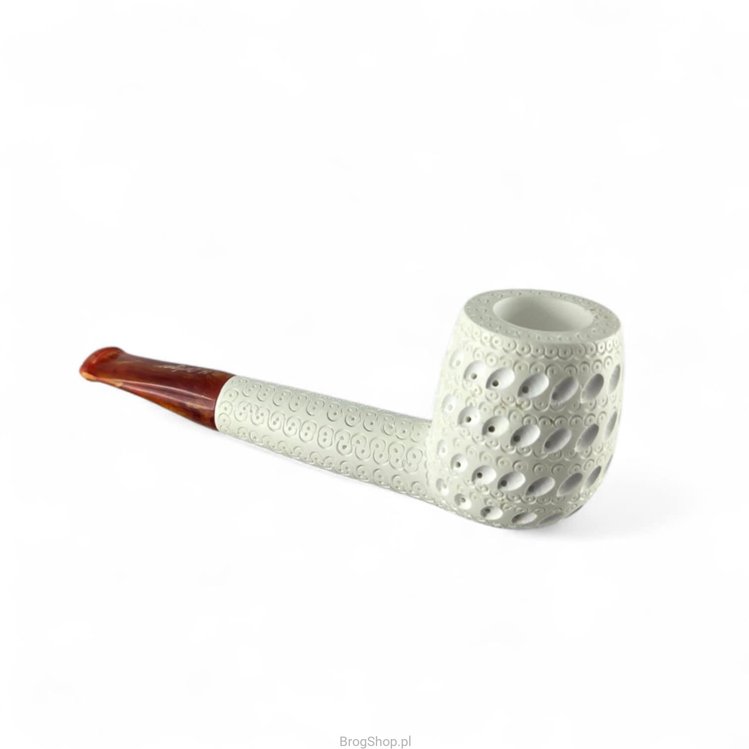 A stylish tobacco pipe, handcrafted from meerschaum by skilled Turkish artisans with years of experience. This classic billiard-style model features a traditional, intricate filigree design and a contrasting mosaic acrylic mouthpiece. With standard dimensions and a lightweight build, the pipe is exceptionally practical and comfortable for everyday use.