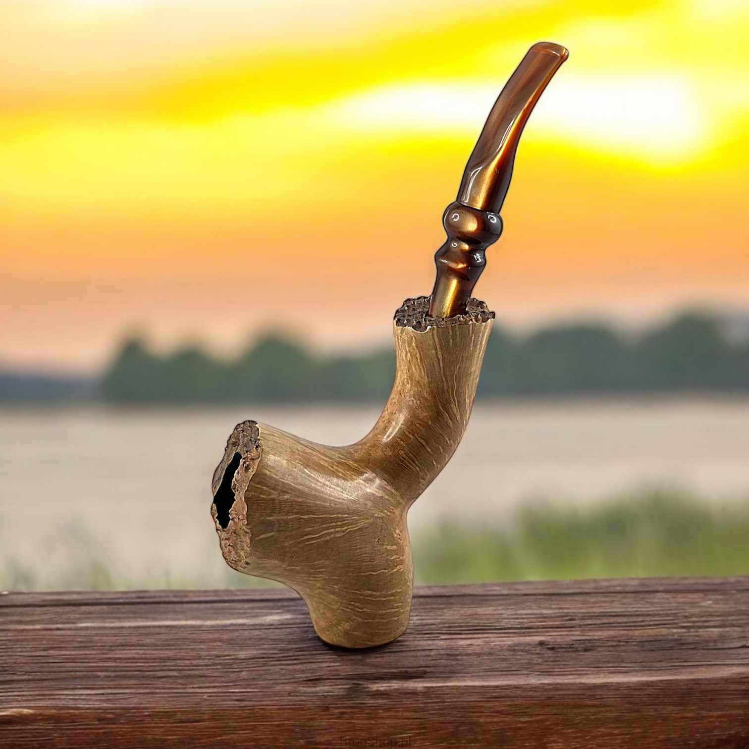 The natural bark has been preserved along the rim of the bowl and the end of the shank, giving the pipe a distinctive and authentic character. Thoughtfully designed with a flat-cut base, it can rest securely on any surface without the need for a stand. The briar remains in its natural hue—unstained and finished solely with a durable carnauba wax polish, highlighting the exquisite beauty of the wood grain.