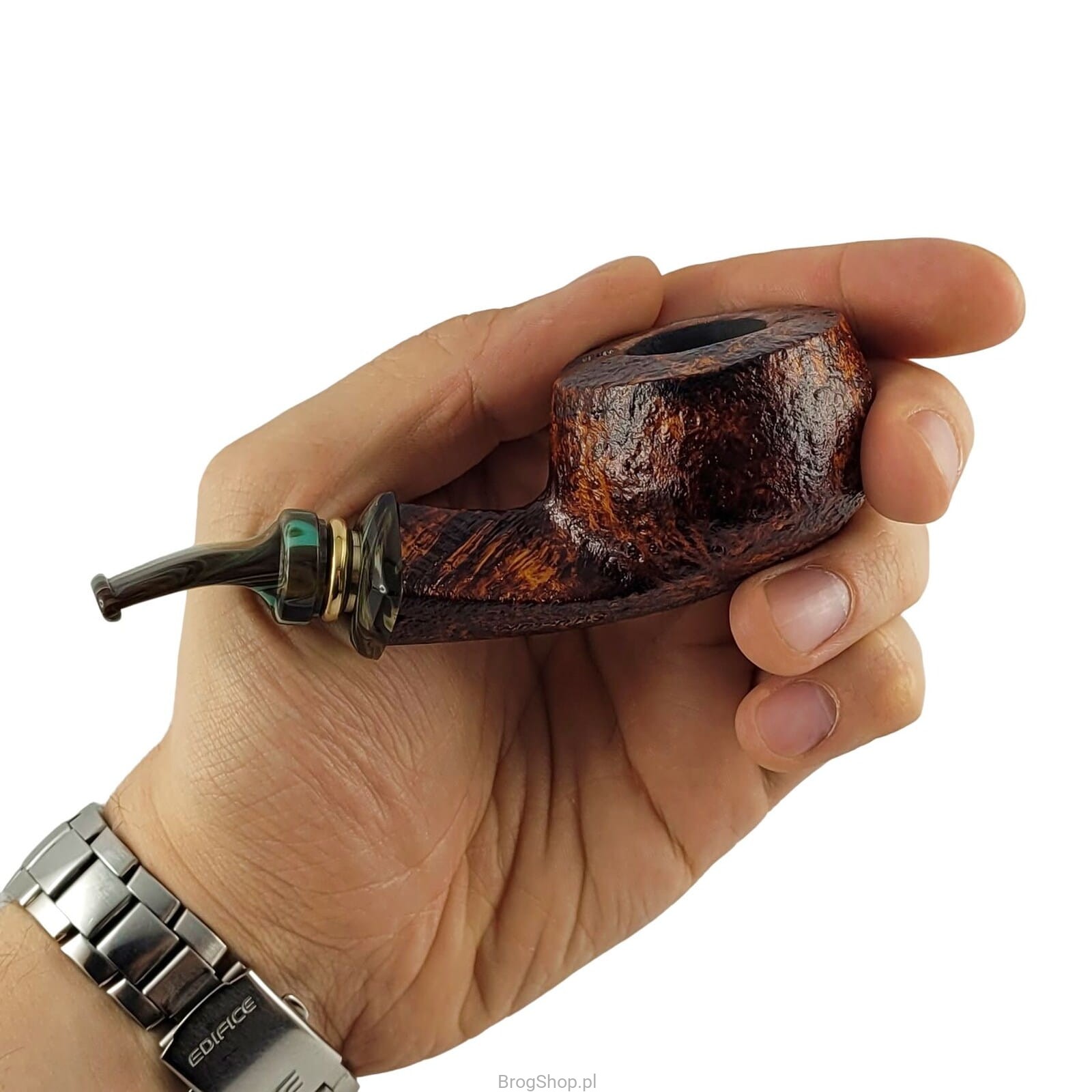 The Classic Series GR2.2 is a remarkable creation from a Danish master pipe maker. This briar pipe, crafted in the "Pot" style and selectively stained, features a solid yet low-profile bowl, paired with a short stem and mouthpiece. The creator, Peder Jeppesen, personally handed us this pipe during the InterTabac 2024 event. The design prioritizes user comfort, as it fits perfectly in hand without feeling too heavy. The bowl is spacious and pre-carbonized, ensuring an easier first smoking experience. The patterned acrylic mouthpiece includes a slot for a filter. The connection between the stem and mouthpiece is accentuated with two rings: one in acrylic to match the mouthpiece and the other in golden aluminum. The set includes the pipe, an elegant fabric pouch, and four sturdy pipe cleaners. Only one piece is available, as shown in the photos—highly recommended!