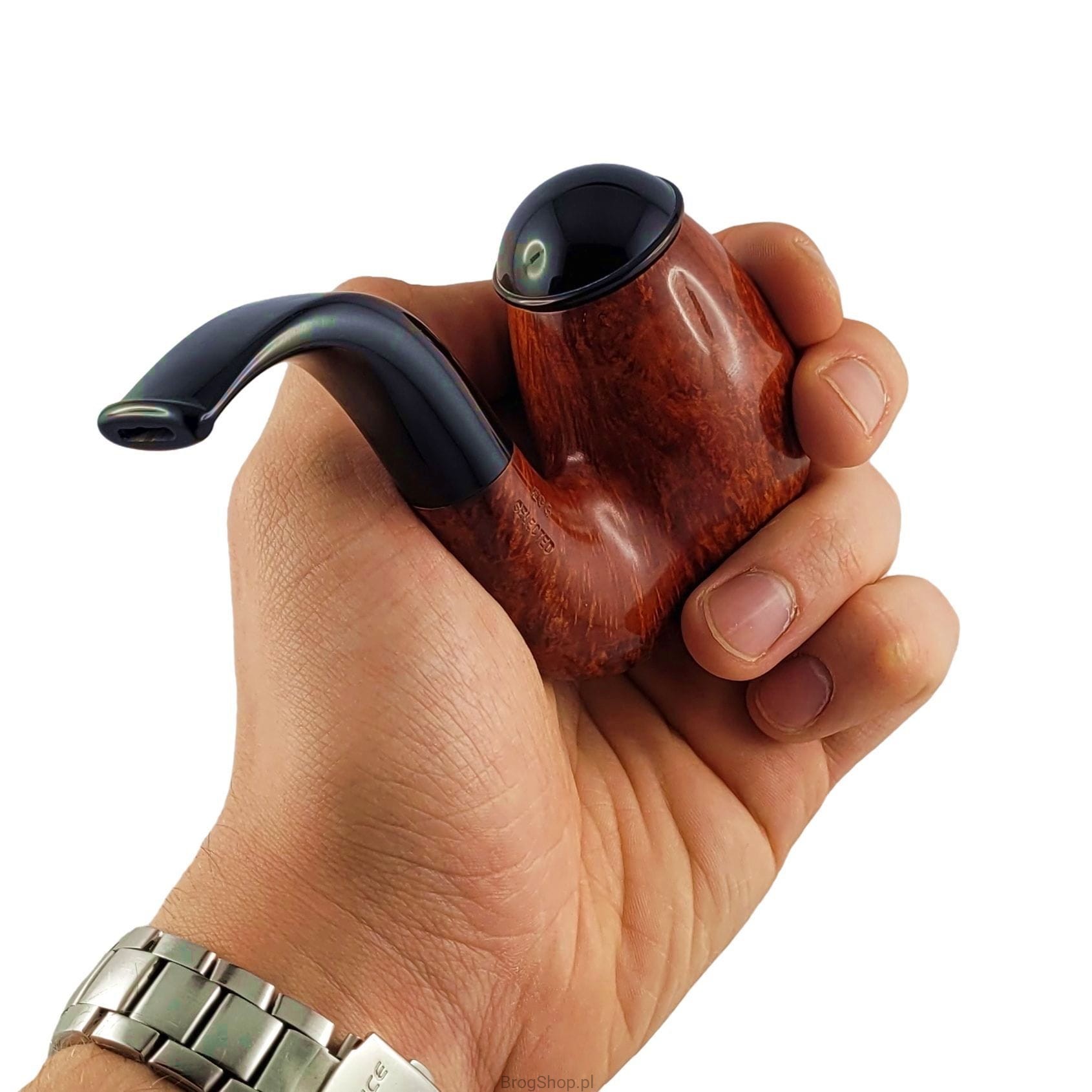A stylish pipe with a timeless OOM Paul shape and an Egg-shaped bowl. The "Selected" designation indicates that the briar used in its production was carefully chosen. The spacious chamber is available in both natural and pre-carbonized versions. Noteworthy is the smoke channel, crafted using the so-called bent drill, allowing precise routing through the sharply curved shank. The acrylic stem, featuring a replaceable 9 mm filter, bears the manufacturer’s logo. Pipes of this type are very distinctive and comfortable, yet rarely found in catalogs due to the complexity and time-consuming nature of their creation. The set includes a fabric pouch and a box. The Brebbia Egg is an original, handcrafted Italian pipe with a unique design.