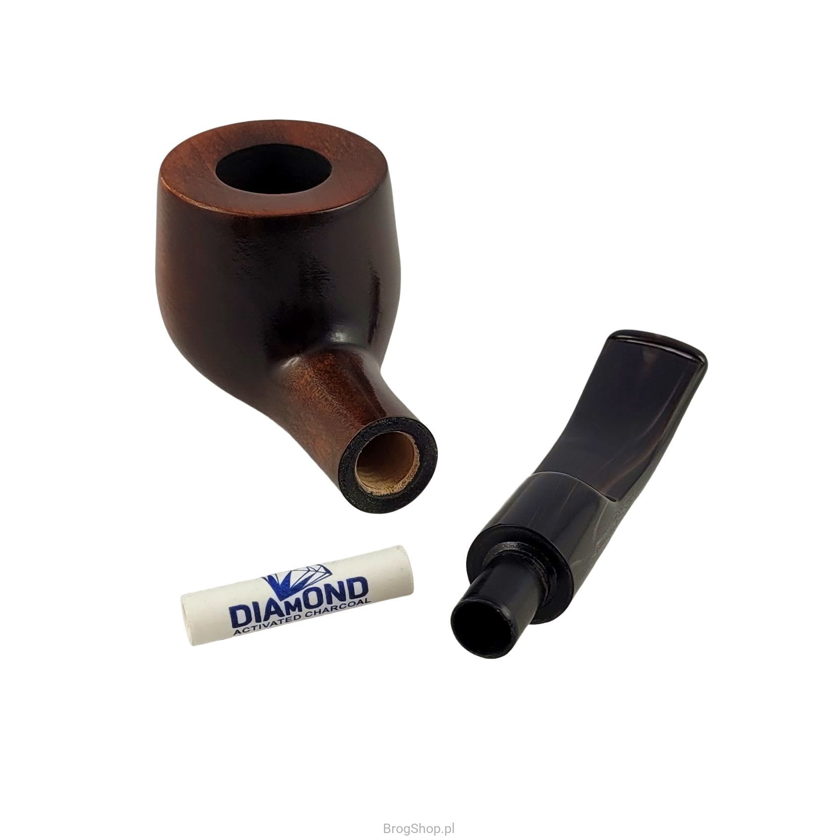 A solid tobacco pipe, handmade from the wood of Polish pear and durable acrylic - all copies are made in our workshop near Przemysl. Due to the construction and parameters of the AB model, we recommend it to beginners. The furnace with the appropriate diameter will simplify the application of tobacco and the subsequent guidance of embers. The walls have a layer of pre-carbonization, which will simplify the faster and more even generation of carbonization, but it should be remembered that this is not a heat-resistant barrier. Each wood pipe should be smoked slowly, in moderation and according to the art, especially during the first sessions. The suggested use for novices, of course, does not preclude use by more experienced pipe smokers. The pipe has an interesting mouthpiece made of acrylic in a non-uniform color (lighter and darker shades of brown) with a place for replaceable 9 mm filters. Teflon spigot. Pipe available in one finish variant shown in photos. The price includes a dedicated box of Bróg Pipes. Recommended!
