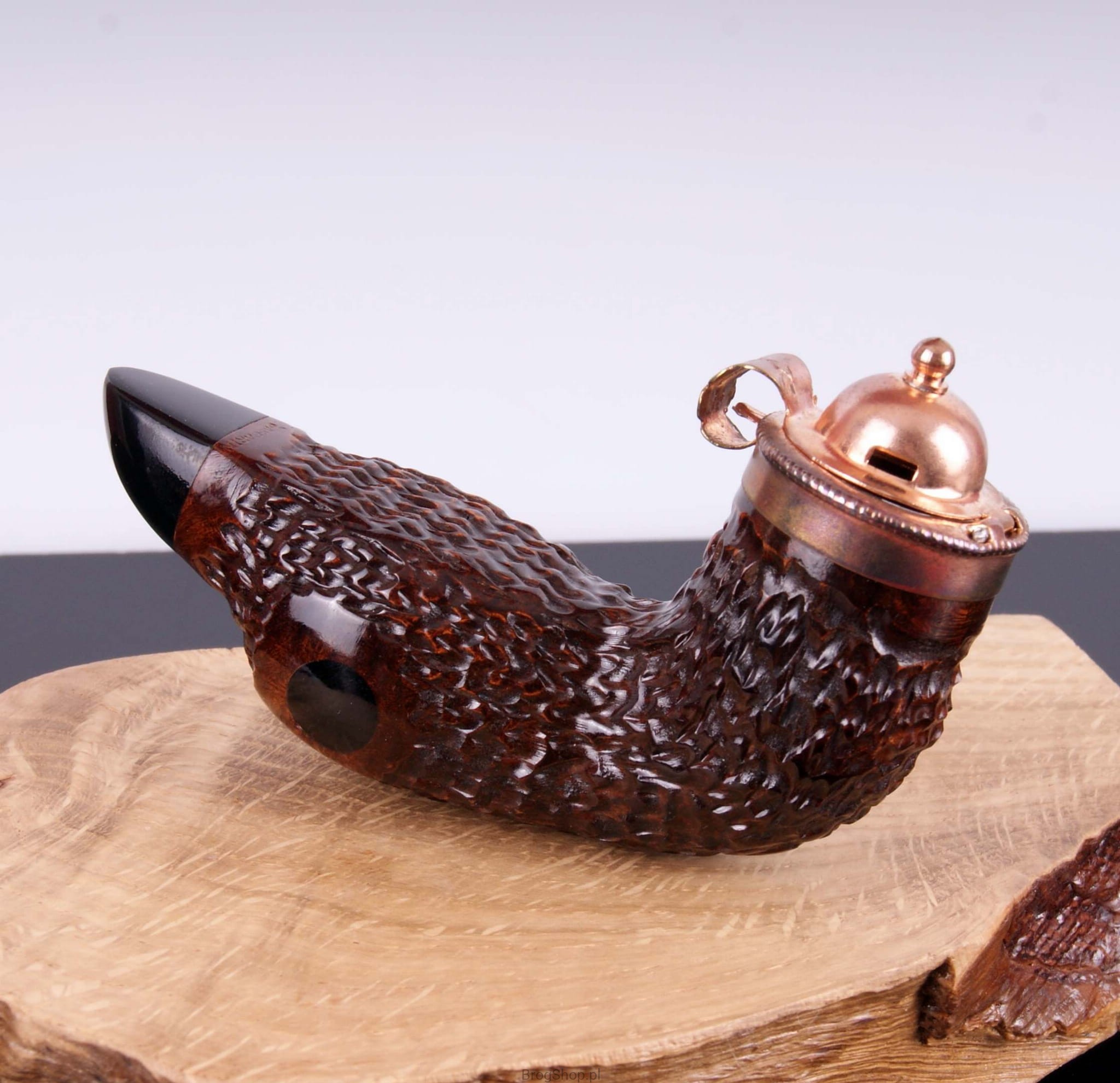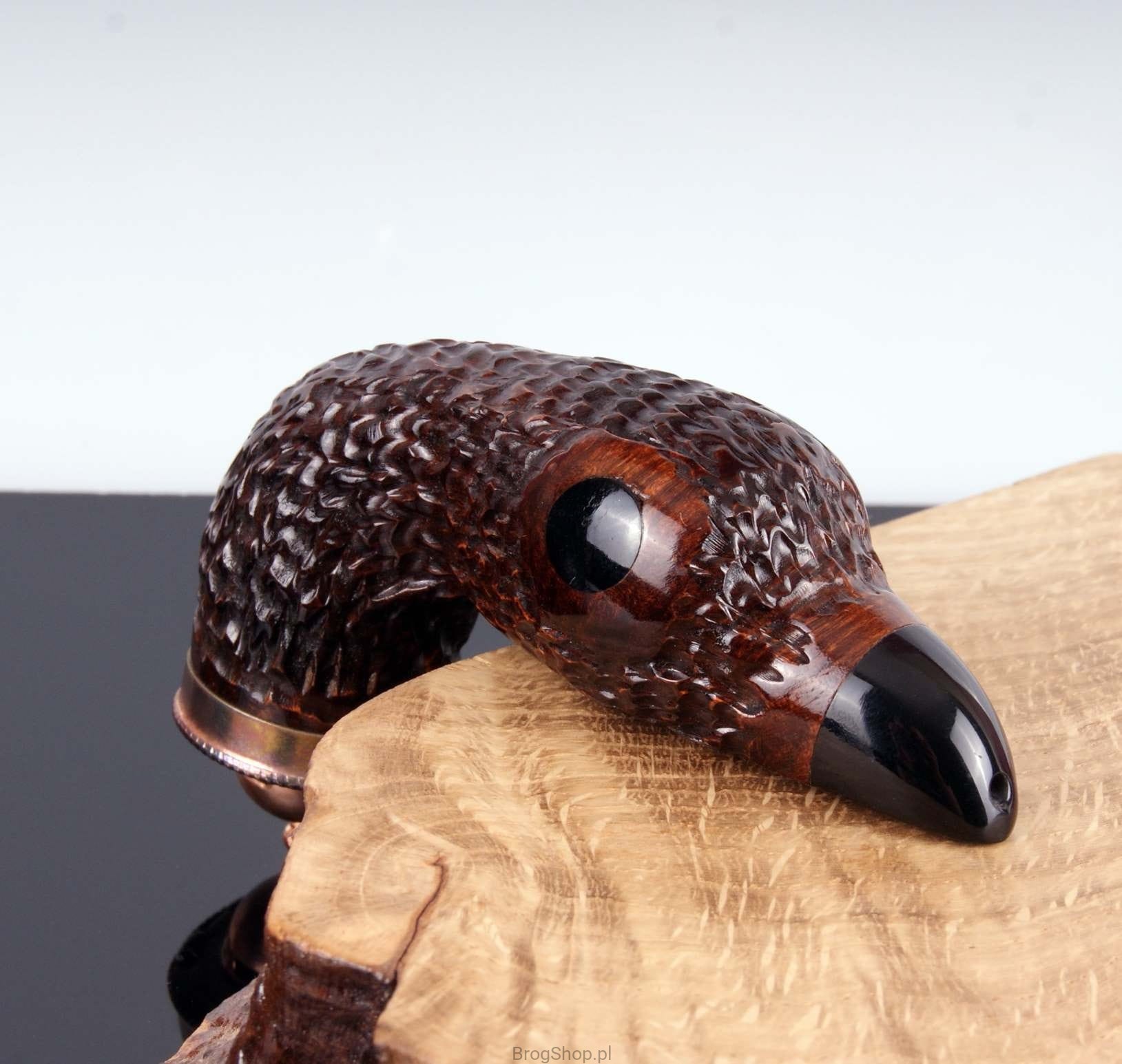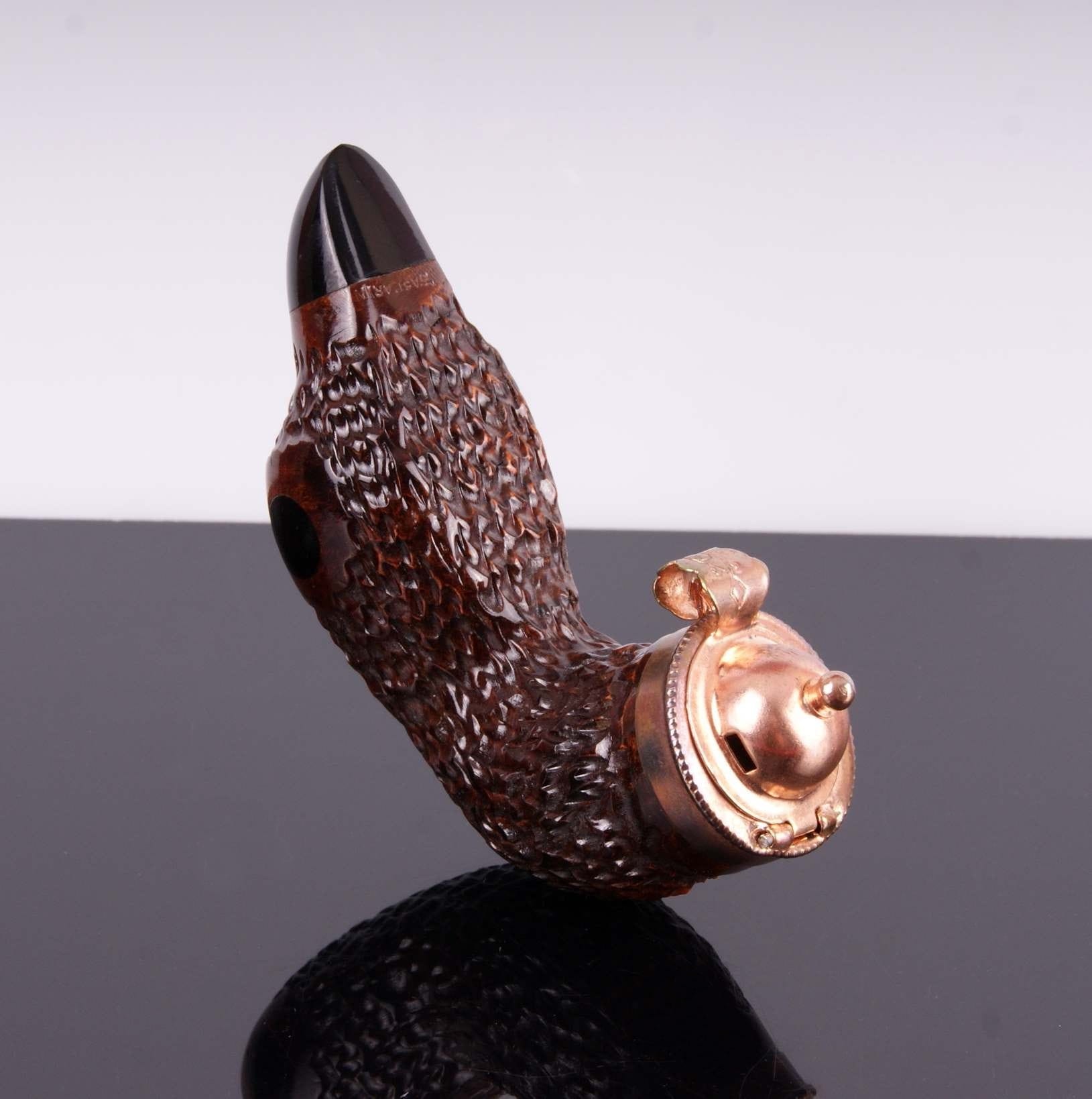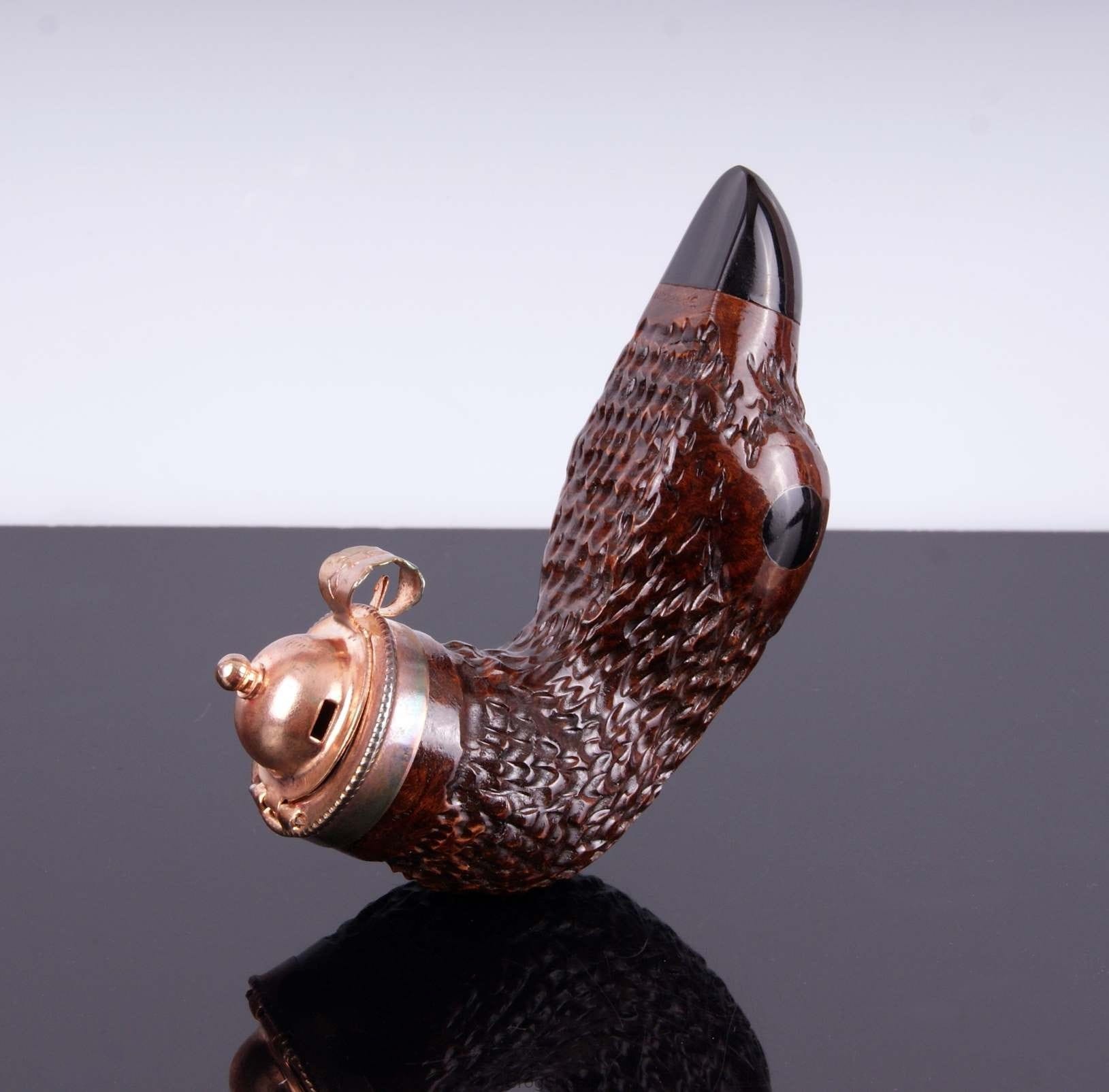 The unique pipe resembling the head of a duck. Hand made of briar wood, ideal gift for hunters. The pipe has a decorative cap.