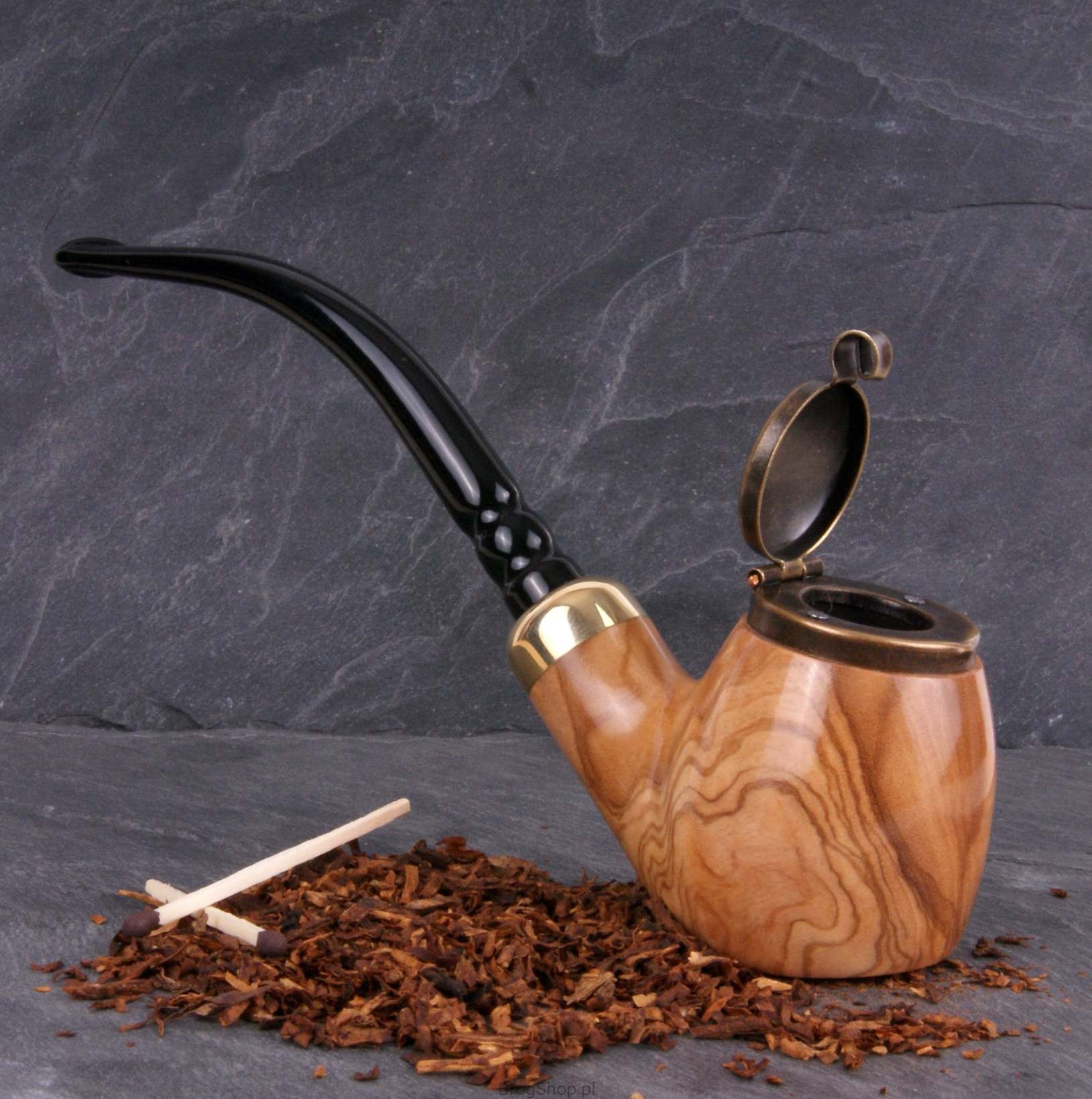 Hand made of olive wood, it is characterized by a bevelled base which makes it easier to use, a long ebonite stem that houses the condenser and a hood that protects the heat from the wind. Similar caps were used by soldiers in the past in order not to lose tobacco during the march and to make smoking easier. There is no need to convince the beauty of olive wood, it is worth mentioning that it is a very durable material with antibacterial properties that can hardly absorb odors. The pipe is packed in a cover and an original box of our studio. The currently available stem and flap pattern is shown in the first and last photo.