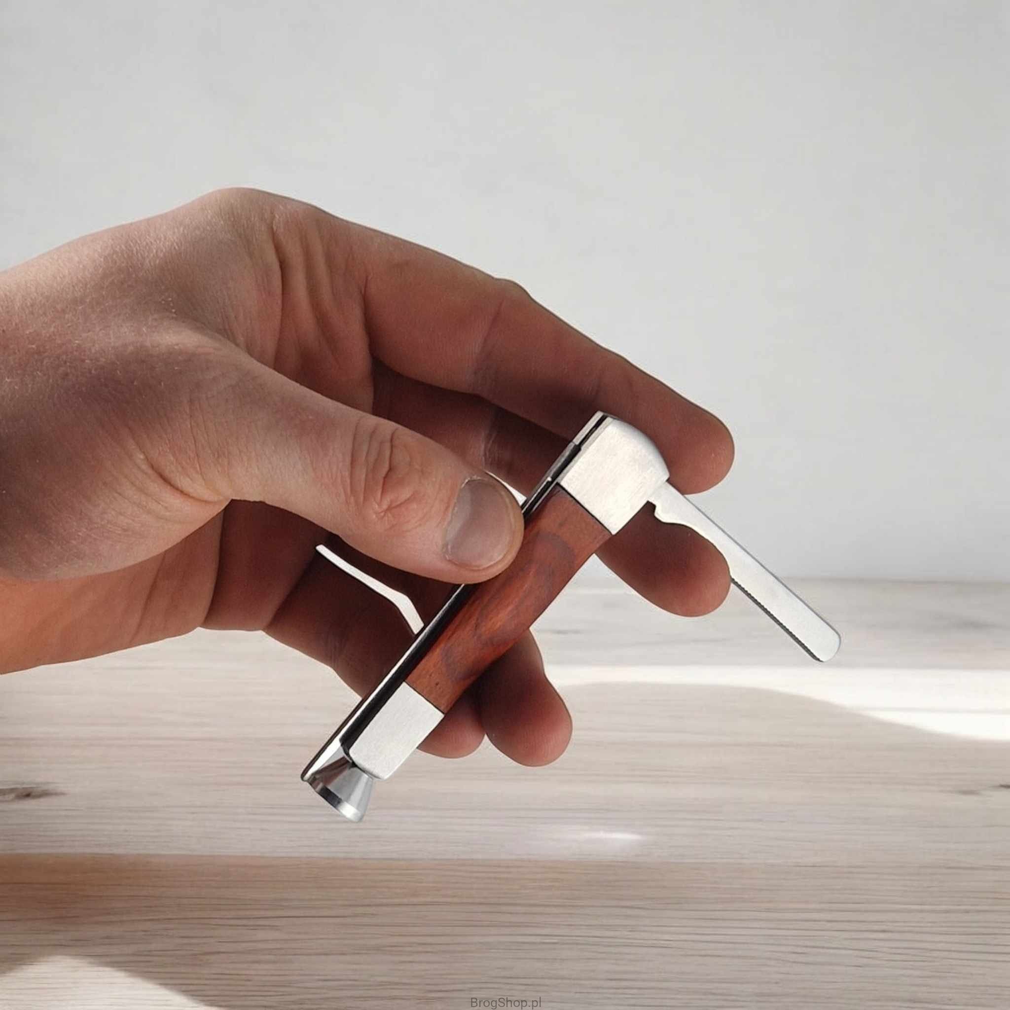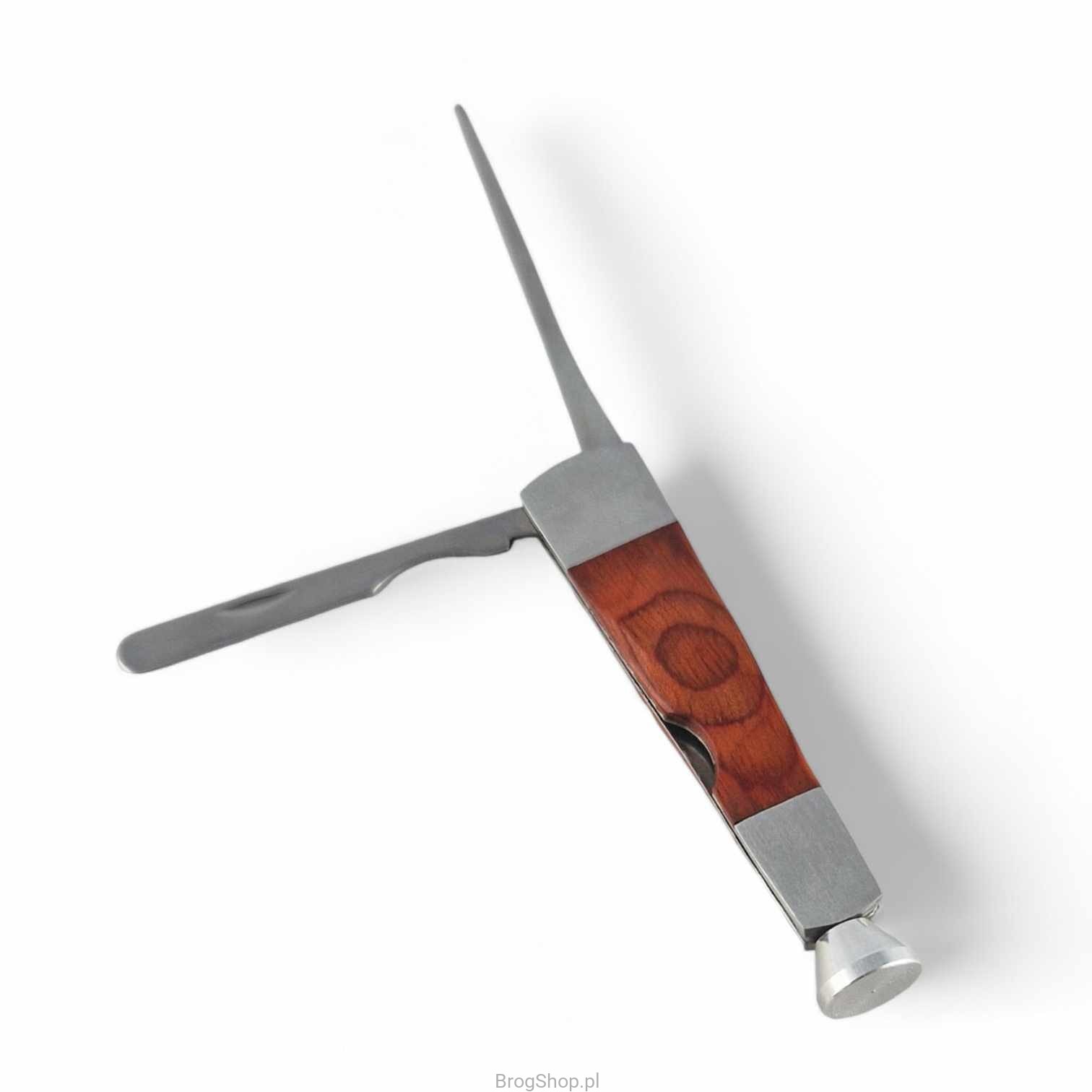 A unique and functional pipe tool, carefully crafted from metal and elegantly finished with wood. This indispensable accessory includes a tamper, reamer, and spoon, allowing for convenient and safe removal of tobacco residue from the bowl. Its lightweight construction, versatility, stylish design, and attractive price make it an ideal accessory for every pipe enthusiast.