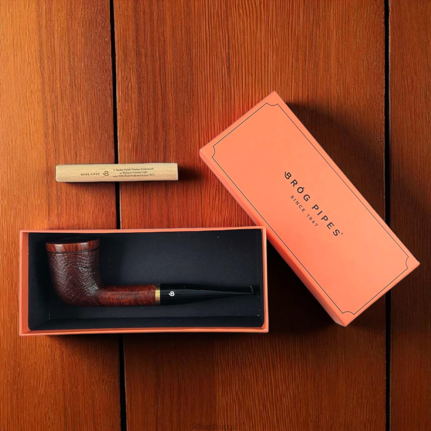 Limited-edition competition pipe handcrafted from premium Italian briar (Mimmo, Liguria), created exclusively for the 5th Polish Slow-Smoking Cup held in Konin on April 5, 2025. The sandblasted bowl contrasts beautifully with the natural rim and shank, while the pre-carbonized chamber is ready for an even, flavorful smoke. A flat base allows the pipe to stand securely without a rest. The black acrylic stem features a durable Teflon tenon and accepts a 9 mm filter. Each pipe comes with a soft fabric pouch and an elegant gift box. Extremely limited availability.