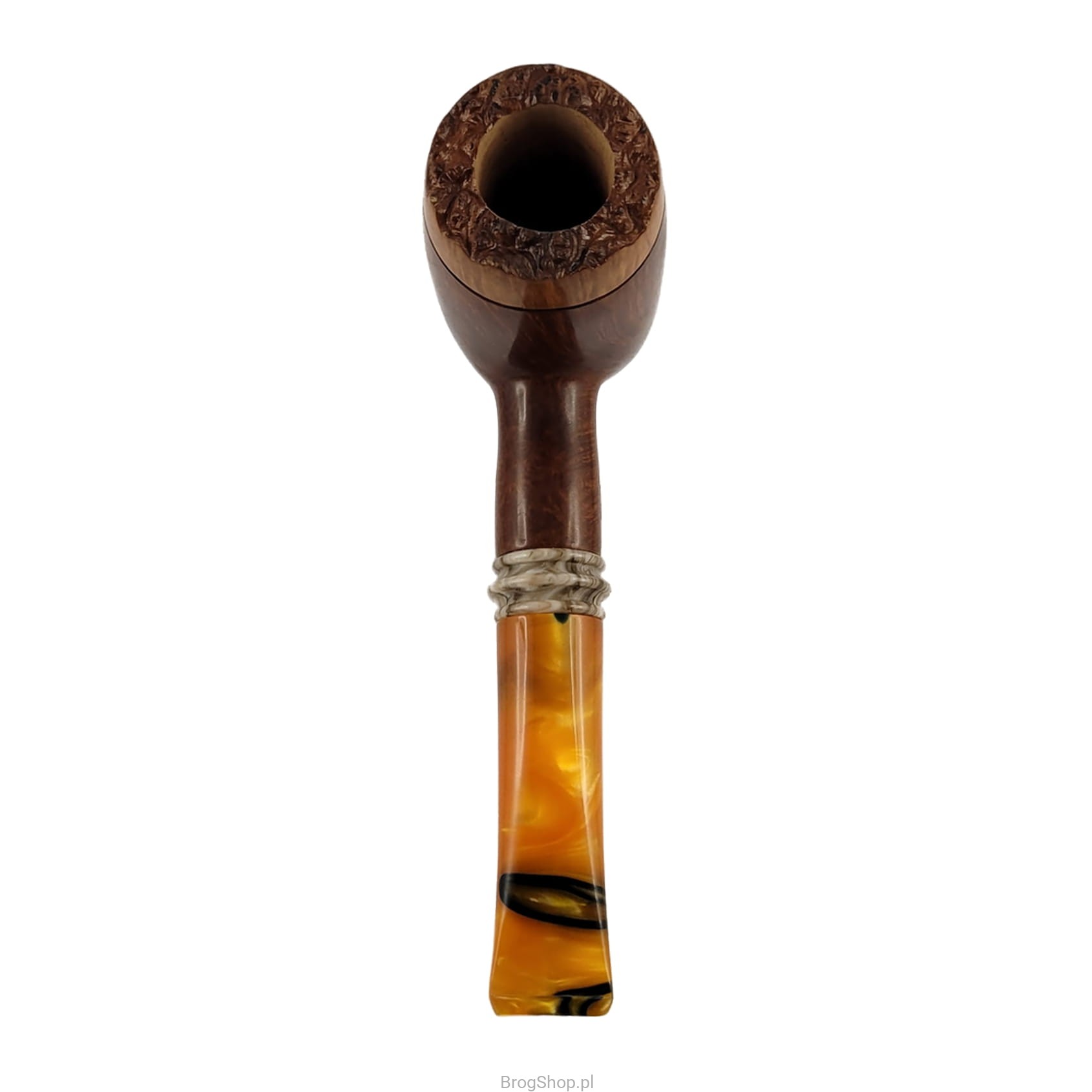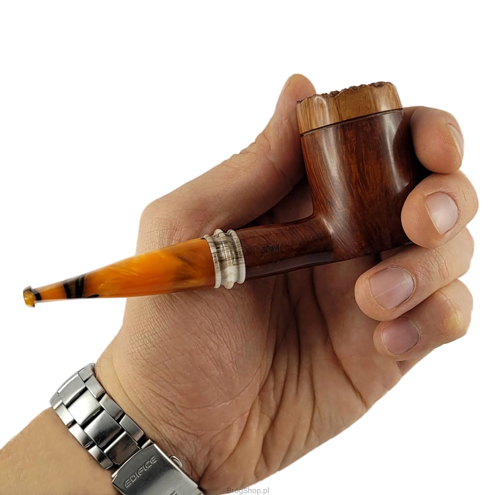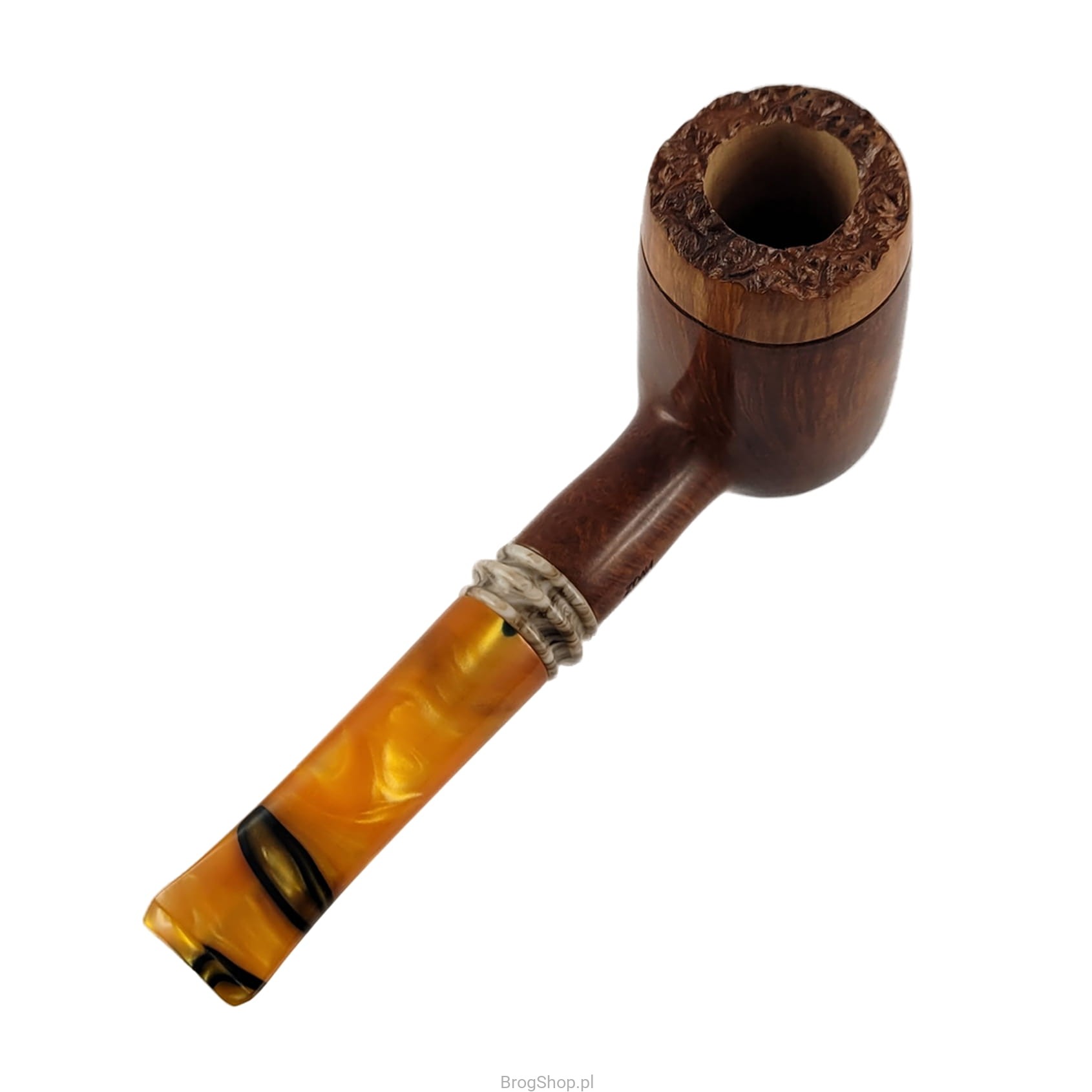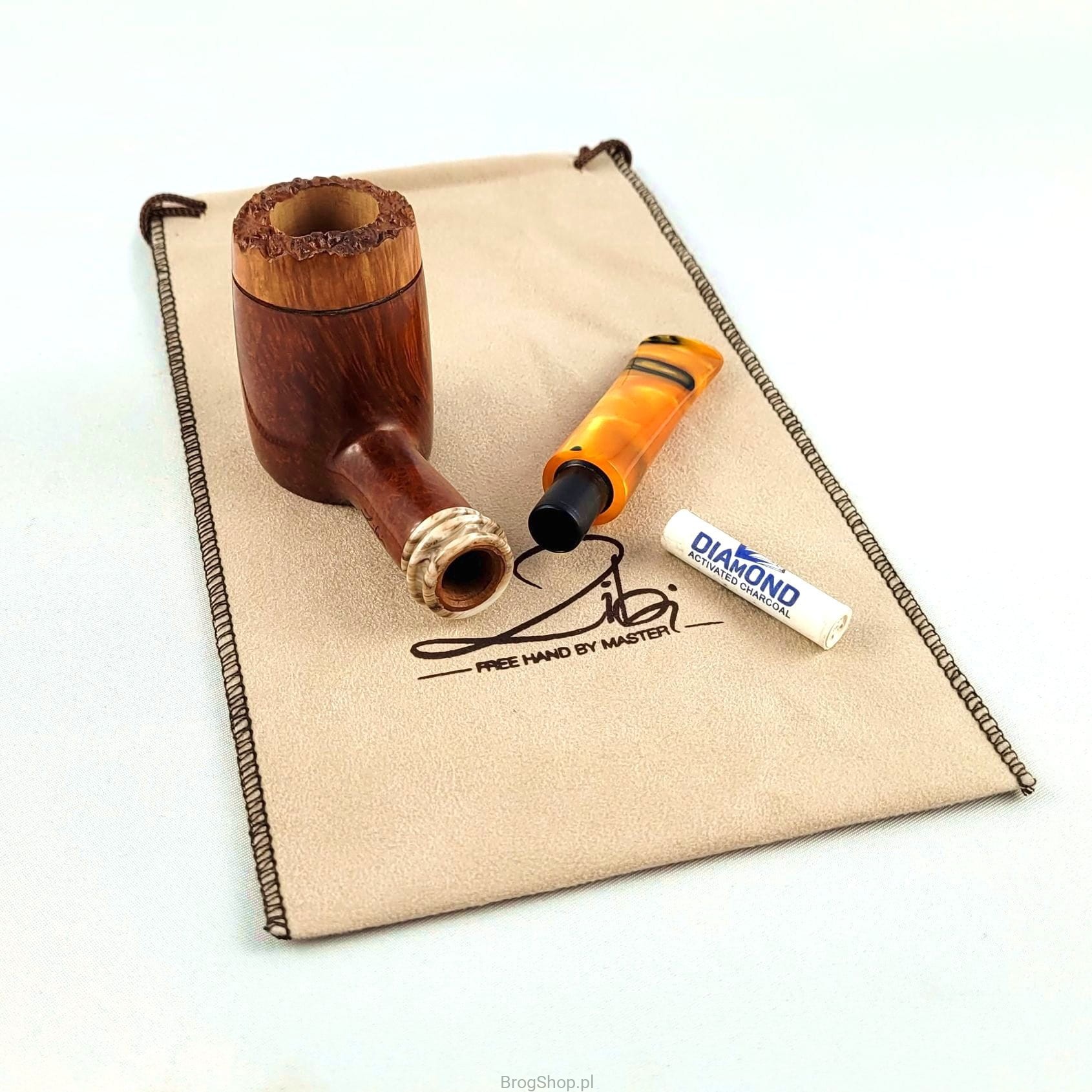 A pipe designed by Zbigniew Bednarczyk - a master pipe maker and the owner of the Bróg studio in Przemyśl, Poland. Handmade from Plateau briar from MIMMO (Romeo Domenico Italy) with very clear and dense grain. The bowl and shank of the pipe are stained in a warm shade of brown, the rim of the pipe has remained natural, which gives the whole an interesting character. The standard furnace (dimensions below) has natural walls, without precarbonate. The base of the bowl makes it possible to put the pipe down without the help of a stand, which is a very convenient solution. Acrylic stem with a characteristic mosaic and space for replaceable 9 mm absorbent filters, a decorative ring crowning the shank of the pipe is also made of this material. Cover and elegant box included. Waxed briar. Only one piece is available, visible in the attached photos - we recommend expanding the list of photos or clicking on one of them to open a large gallery.