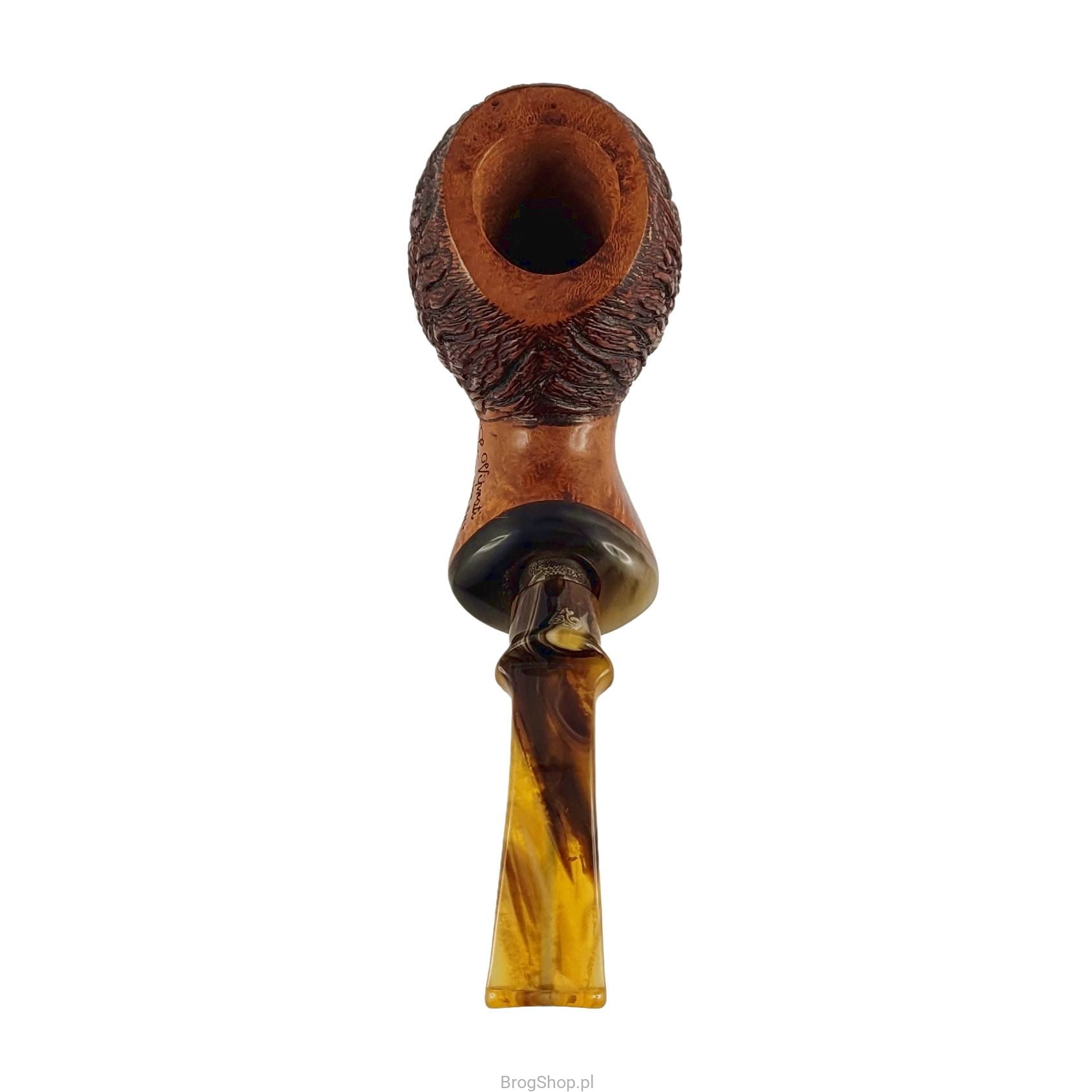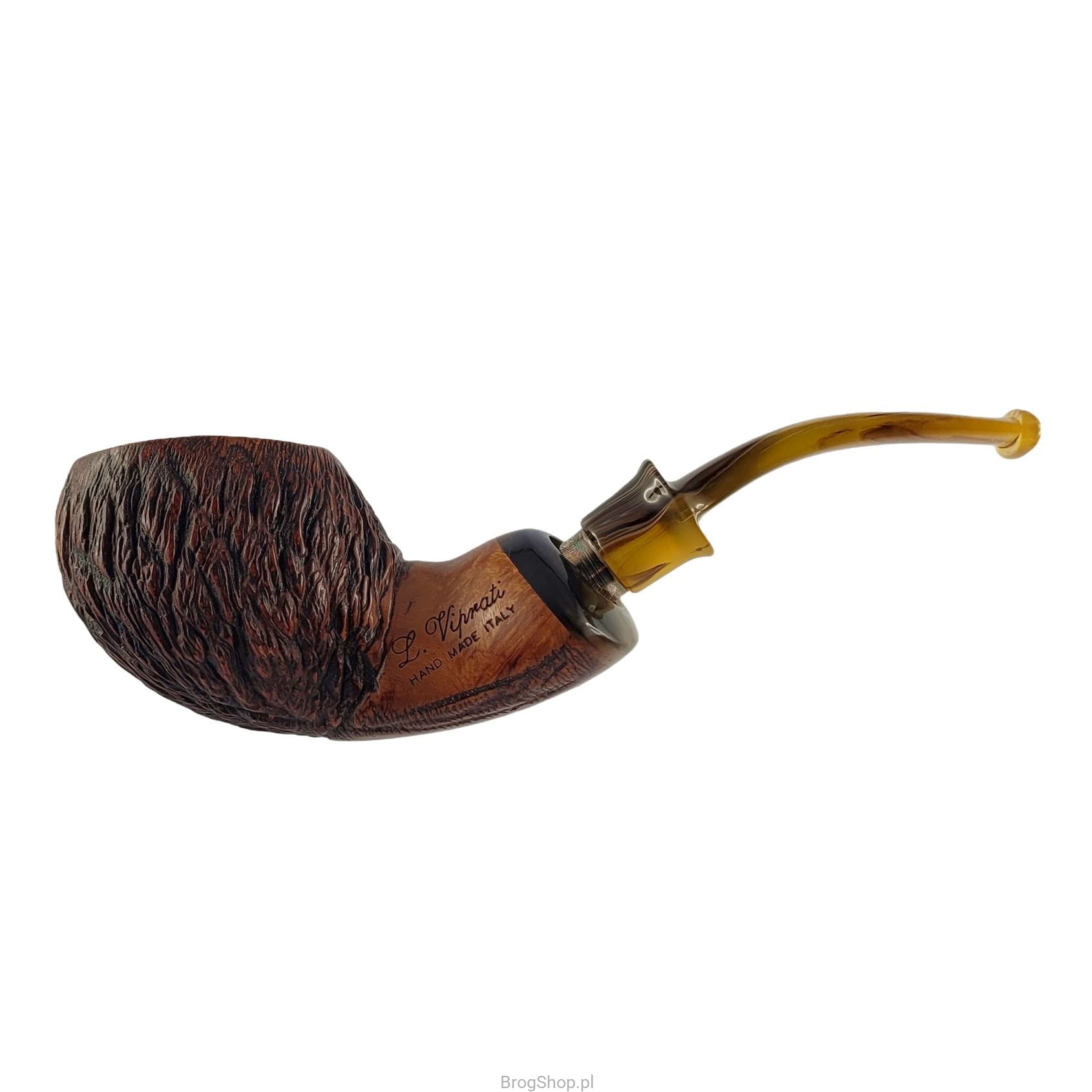Ciekawa wrzoścowa fajka, wykonana ręcznie przez cenionego i znanego włoskiego wytwórcę - Luigi Viprati. Charakterystyczna faktura główki, powstała w wyniku ryflowania oraz szczotkowania wrzośca. Rim oraz częściowo szyjka pozostały gładkie, palenisko naturalne bez prekarbonizatu. Szeroka szyjka fajki została zakończona ściśle dopasowanym pierścieniem z akrylu. Ustnik również powstał z akrylu, posiada metalowe wykończenie, firmowe oznaczenie oraz miejsce na wymienne filtry 9 mm. Dostępna tylko jedna sztuka widoczna na zdjęciach.