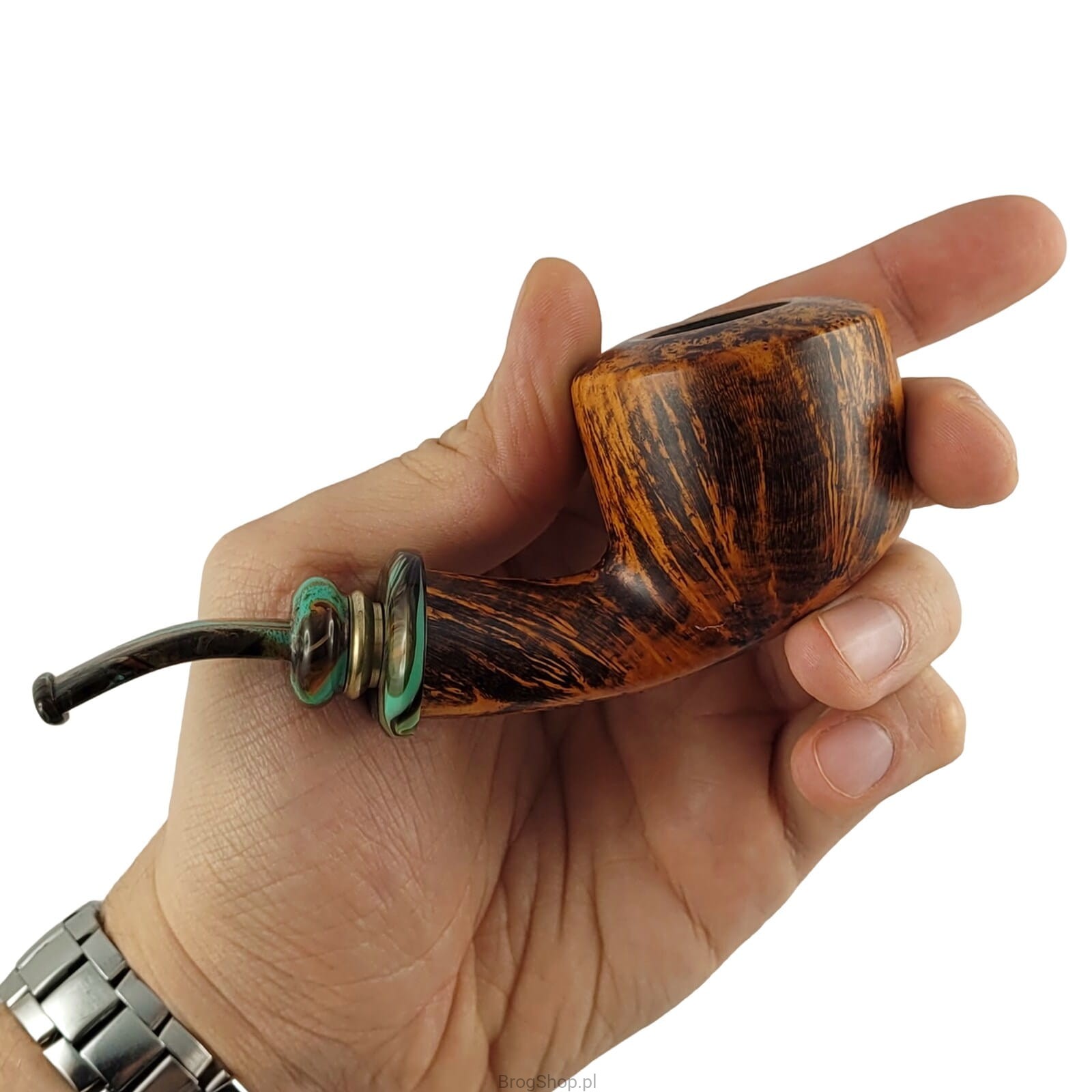 Ta wyjątkowa fajka z wrzośca, ręcznie stworzona przez duńskiego mistrza Pedera Jeppesena, natychmiast zwraca uwagę swoim unikalnym stylem, który twórca rozwijał przez lata. Kompaktowa, ale masywna konstrukcja, z akrylowym ustnikiem i ozdobnym, kolorowym pierścieniem, nadaje jej elegancji. Starannie wyselekcjonowane bejcowanie doskonale podkreślają naturalne piękno wrzoścowego drewna, sprawiając, że fajka wyróżnia się swoją niepowtarzalną estetyką. Układ włókien tworzy ciekawy "Flame Grain" z widocznymi pawimi okami na rimie fajki. Palenisko jest prekarbonizowane, a ustnik przygotowany pod filtry o średnicy 9 mm. W komplecie znajduje się również materiałowy pokrowiec. Dostępna jest tylko jedna sztuka, dokładnie ta, którą można zobaczyć na zdjęciach. Zapraszamy do obejrzenia pełnej galerii.