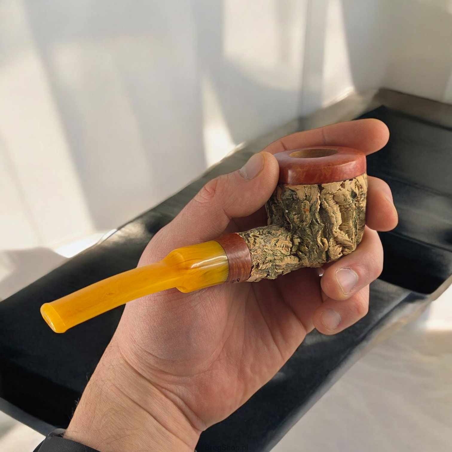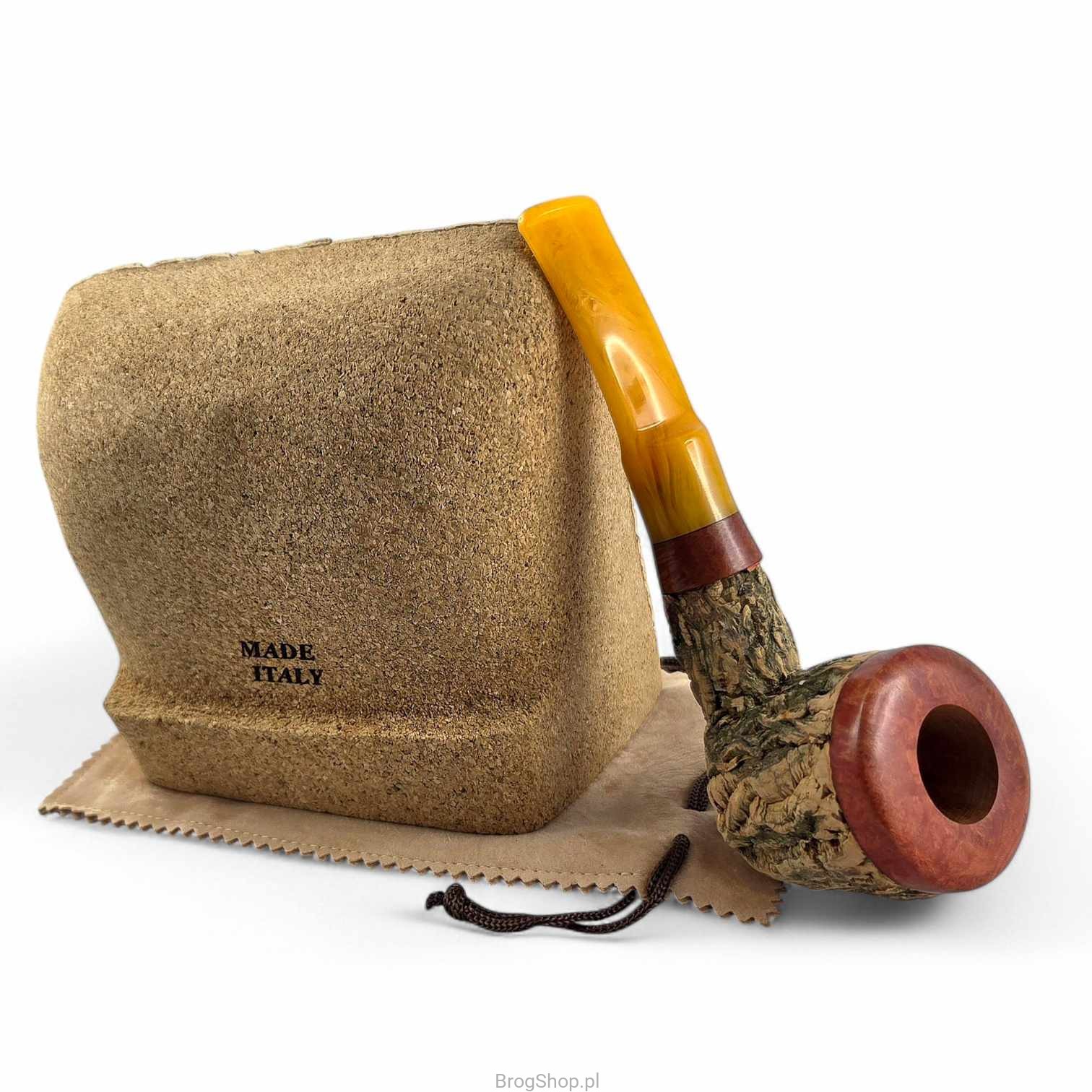 Wyjątkowa fajka marki Tom Spanu, stworzona zgodnie z zarejestrowanym patentem - certyfikat potwierdzający oryginalność znajduje się w zestawie. Fajka wykonana jest ręcznie z wysokiej klasy wrzośca pochodzącego z Sardynii. Wrzosiec ten, na znacznej części główki oraz szyjki, pokryty jest warstwą naturalnego korkowca. Rim fajki oraz zakończenie szyjki przy ustniku, to naturalny wrzosiec przyciemniony bejcą spirytusową - wstawkę z tego drewna znajdziemy również na ustniku wokół srebrnej kropki. Palenisko całkiem pojemne (patrz wymiary), ściany naturalne, bez prekarbonizatu. Ustnik akrylowy z miejscem na wymienne filtry chłonne 9 mm. Całość prezentuje się naprawdę okazale i nietuzinkowo, zachwyci nawet wymagającego fajczarza. W zestawie znajdziemy elegancki mieszek, korkowy stojak dedykowany tej konkretnej fajce oraz świadectwo patentowe. Dostępna wyłącznie jedna sztuka widoczna na zdjęciach.