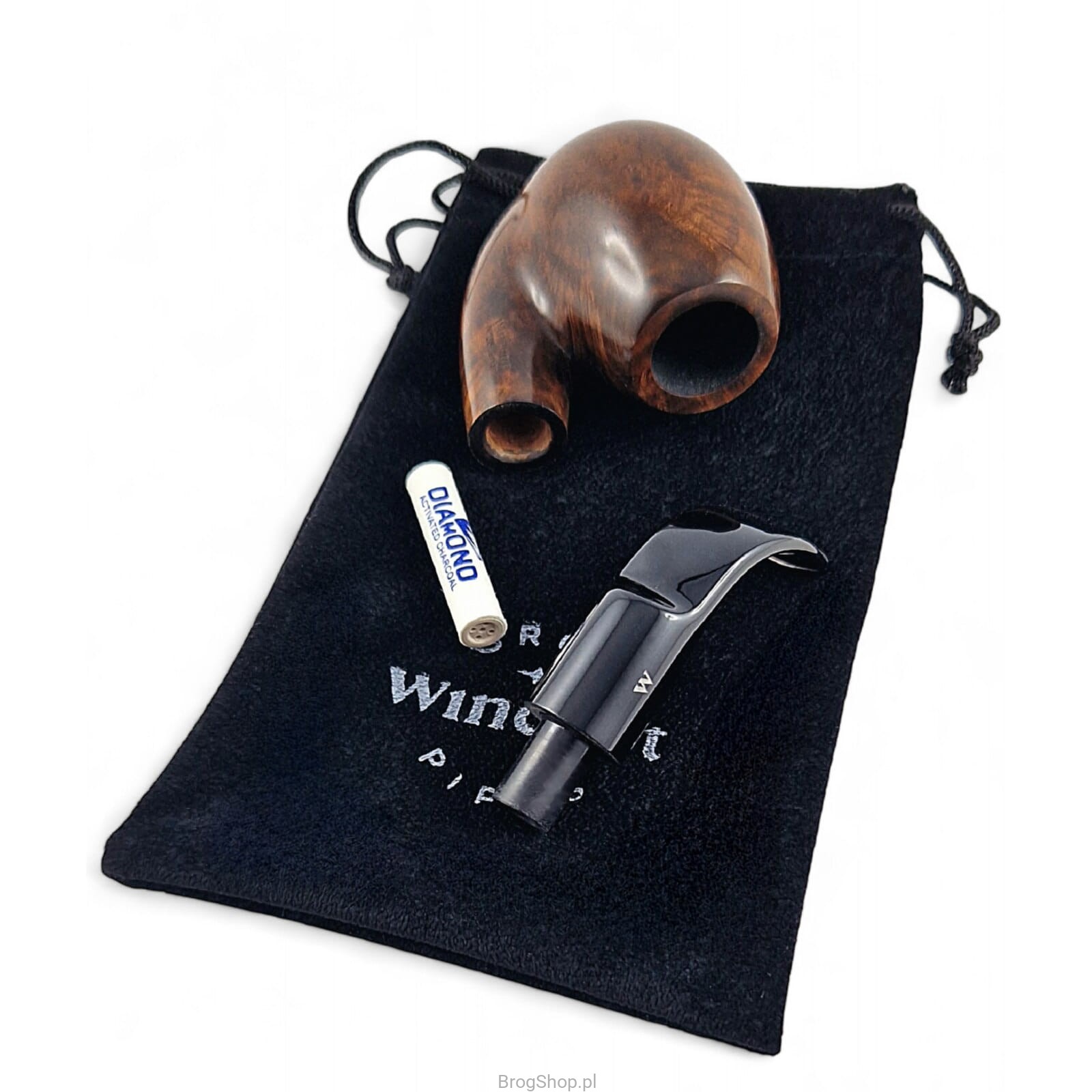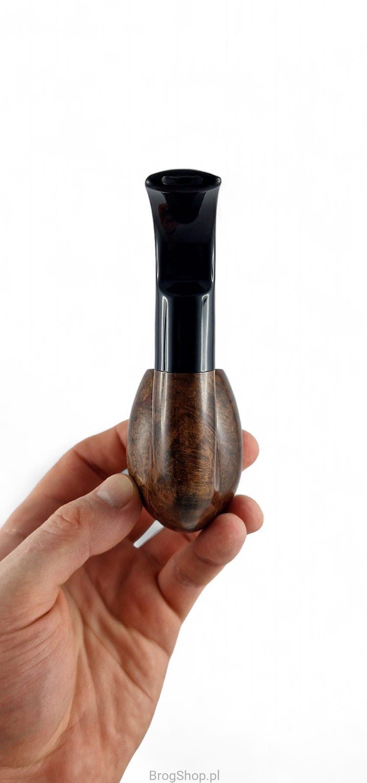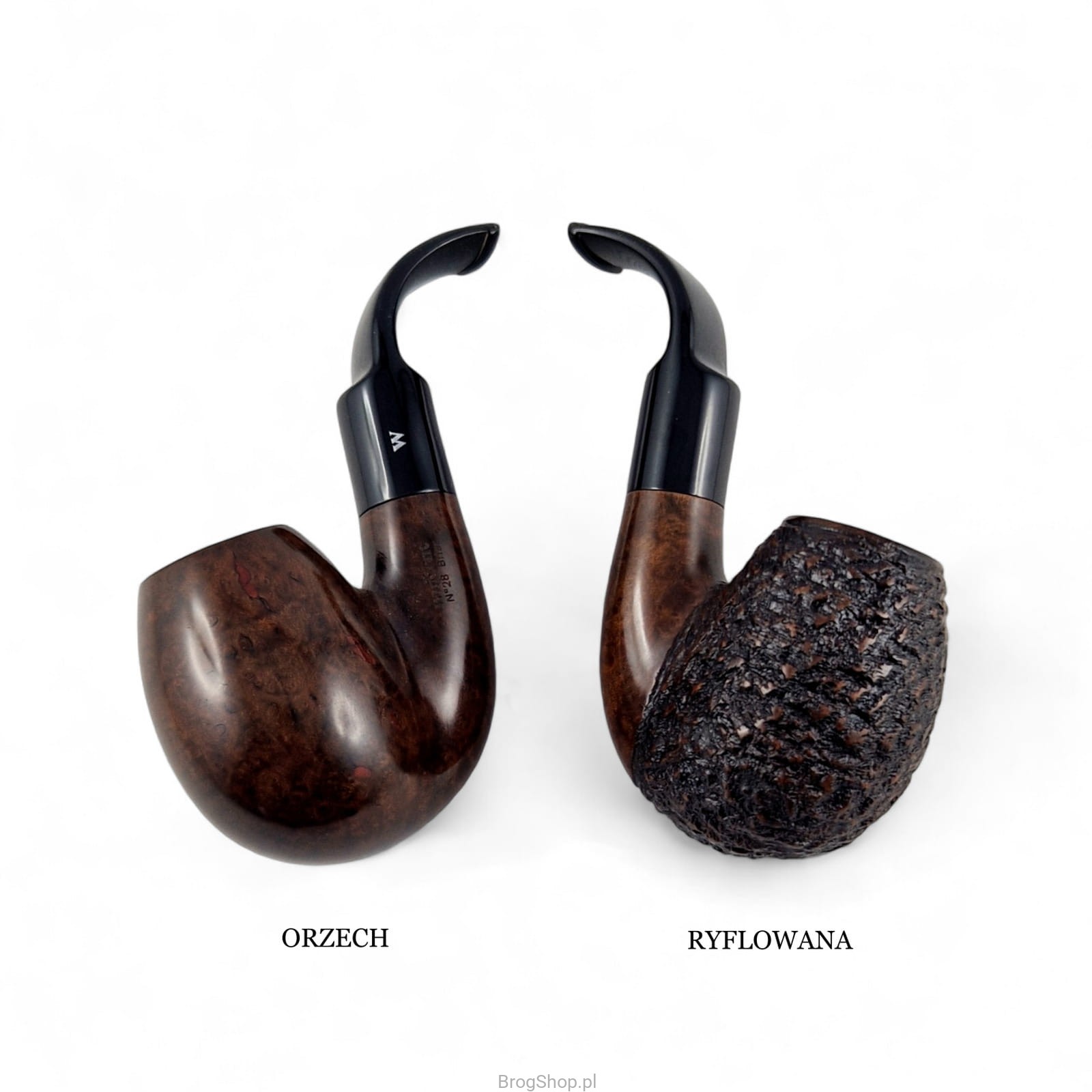 Klasyczny Full Bent, czyli fajka o niemal pionowym wygięciu szyjki i ustnika. Wykonana ręcznie z włoskiego wrzośca w naszej pracowni pod Przemyślem, dostępna jest w dwóch wariantach wykończenia. Powierzchnia fajki woskowana. Model bardzo wygodny, zwłaszcza gdy podczas palenia ręce zajęte są innymi sprawami, fajka wręcz opiera się o brodę. Kolejną cechą charakterystyczną jest pojemność, palenisko fajki pomieści dużą ilość ulubionego tytoniu fajkowego. Ściany paleniska są prekarbonizowane, nowa fajka wymaga jednak odpowiedniego opalenia i wytworzenia prawidłowej warstwy nagaru. Ustnik akrylowy z miejscem na wymienne filtry 9 mm. Na uwagę zasługują niewątpliwie zmysłowe linie fajki, uważamy ten model za bardzo ładny. Zestaw obejmuje fajkę, materiałowy pokrowiec oraz eleganckie pudełko.