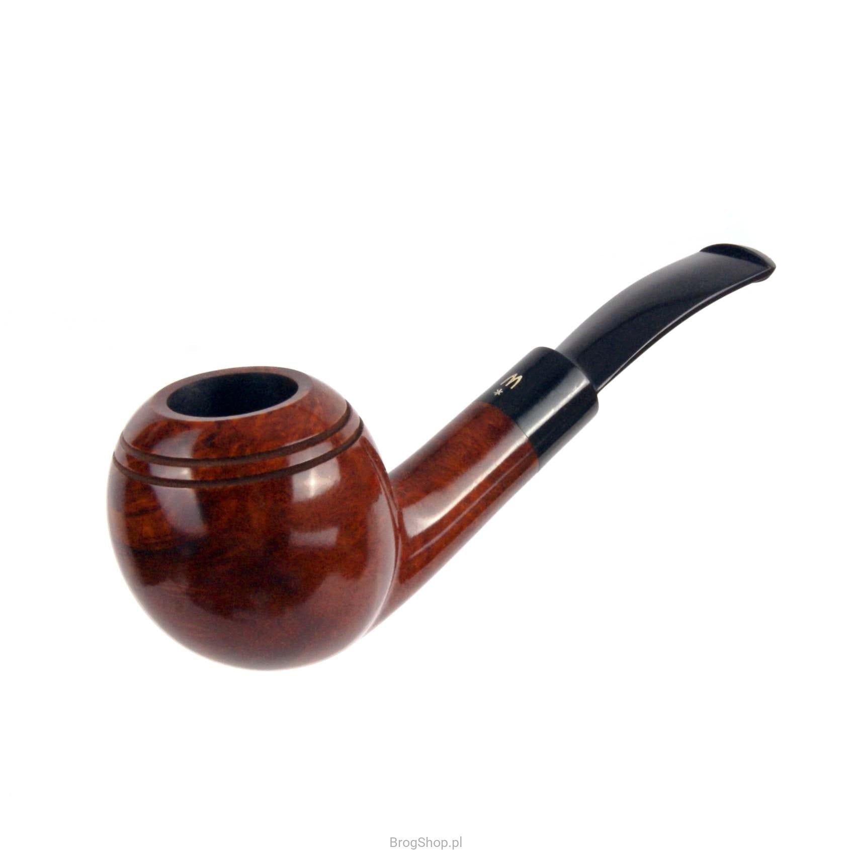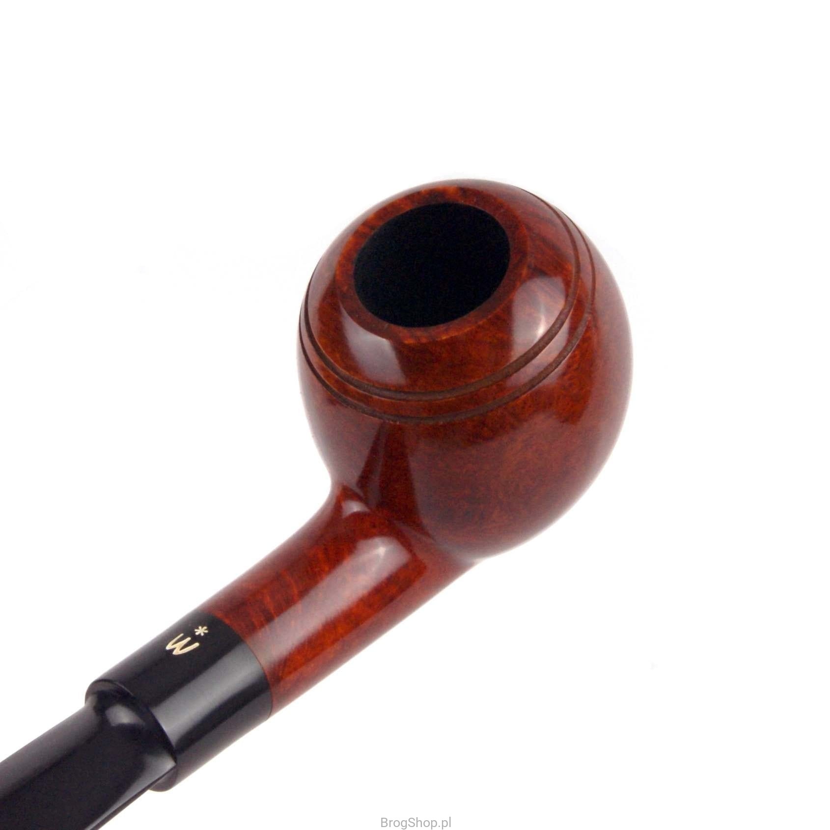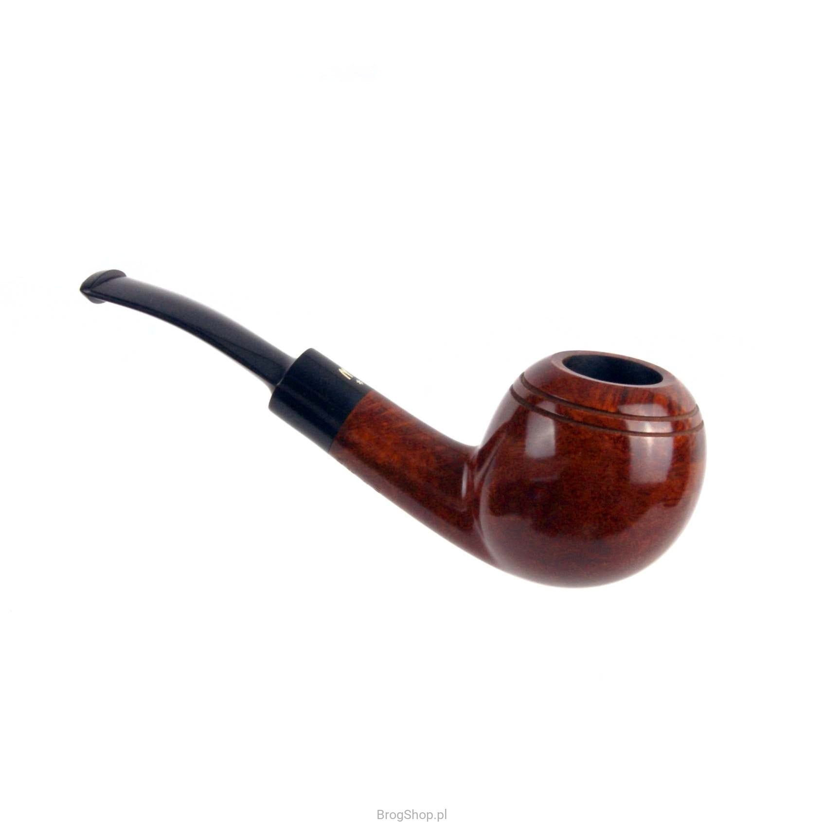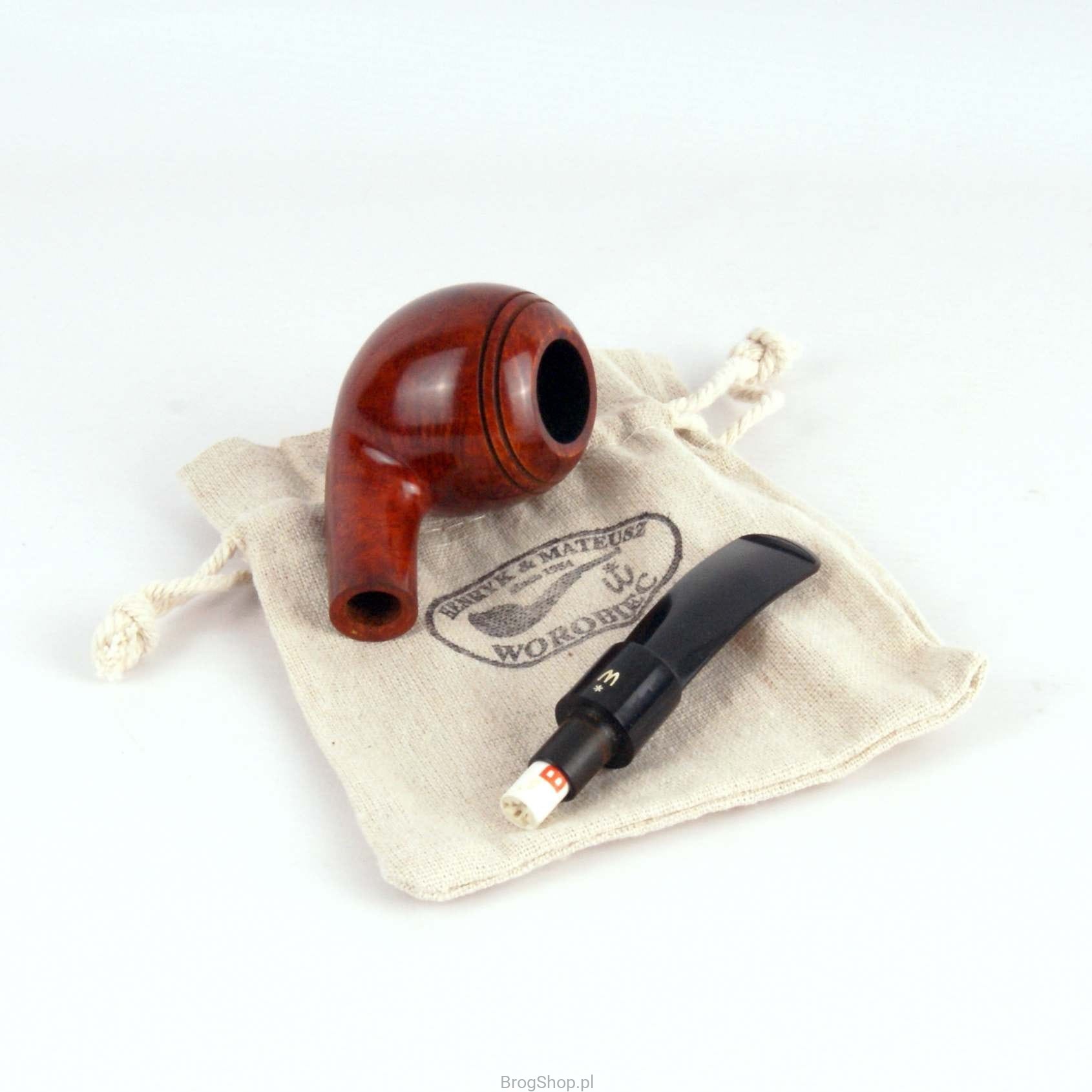 Model nr 124 wykonany z wrzośca przez Wytwórnię Fajek Worobiec. Główka w kształcie "Ball" z nacięciami i wąską krawędzią rimu, nadaje charakter całości. Bejcowanie w głębokim i ciepłym odcieniu brązu. Siodłowy ustnik z logo producenta, wykonany ze styliamidu. W zestawie materiałowy pokrowiec oraz pudełko wytwórcy.