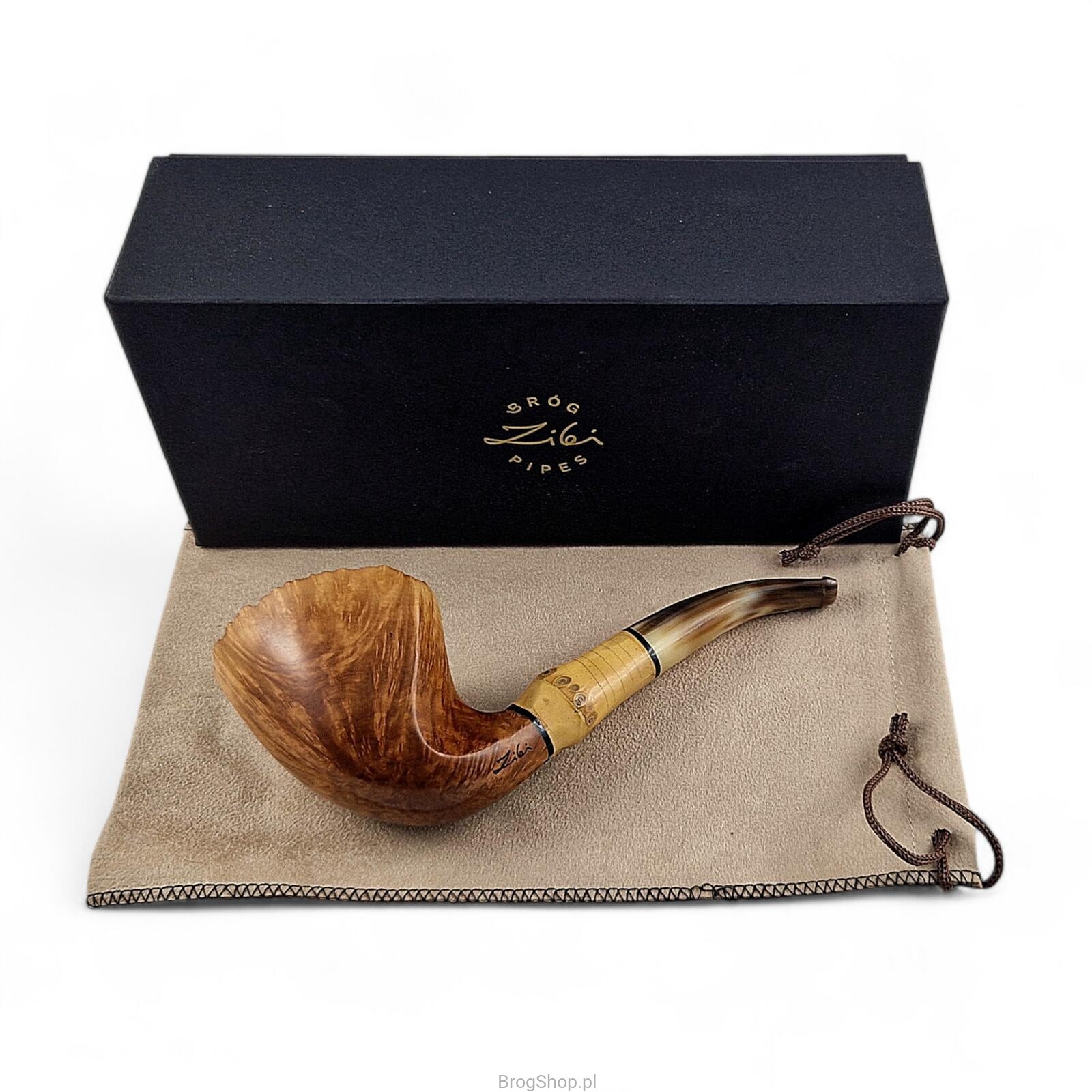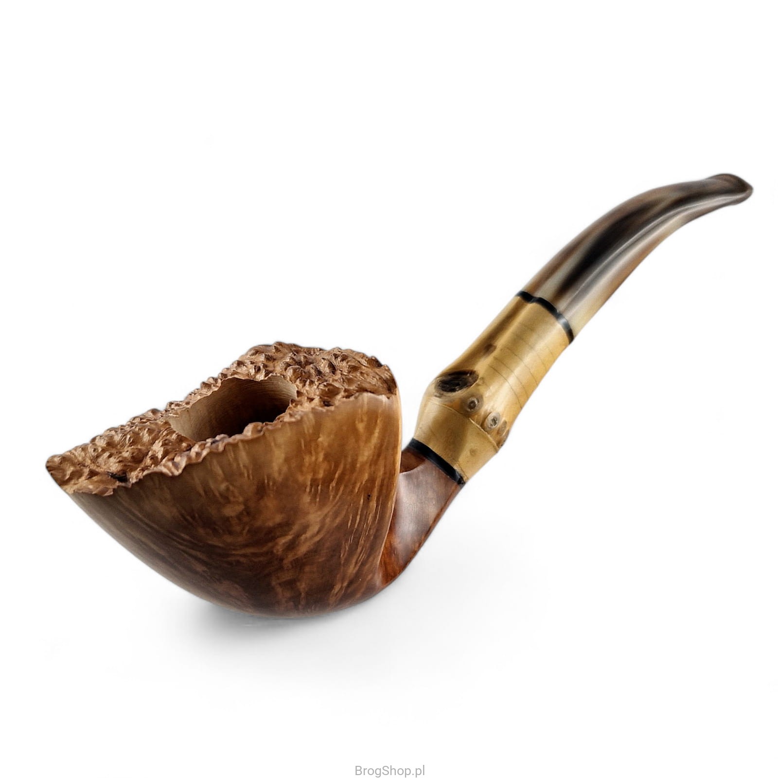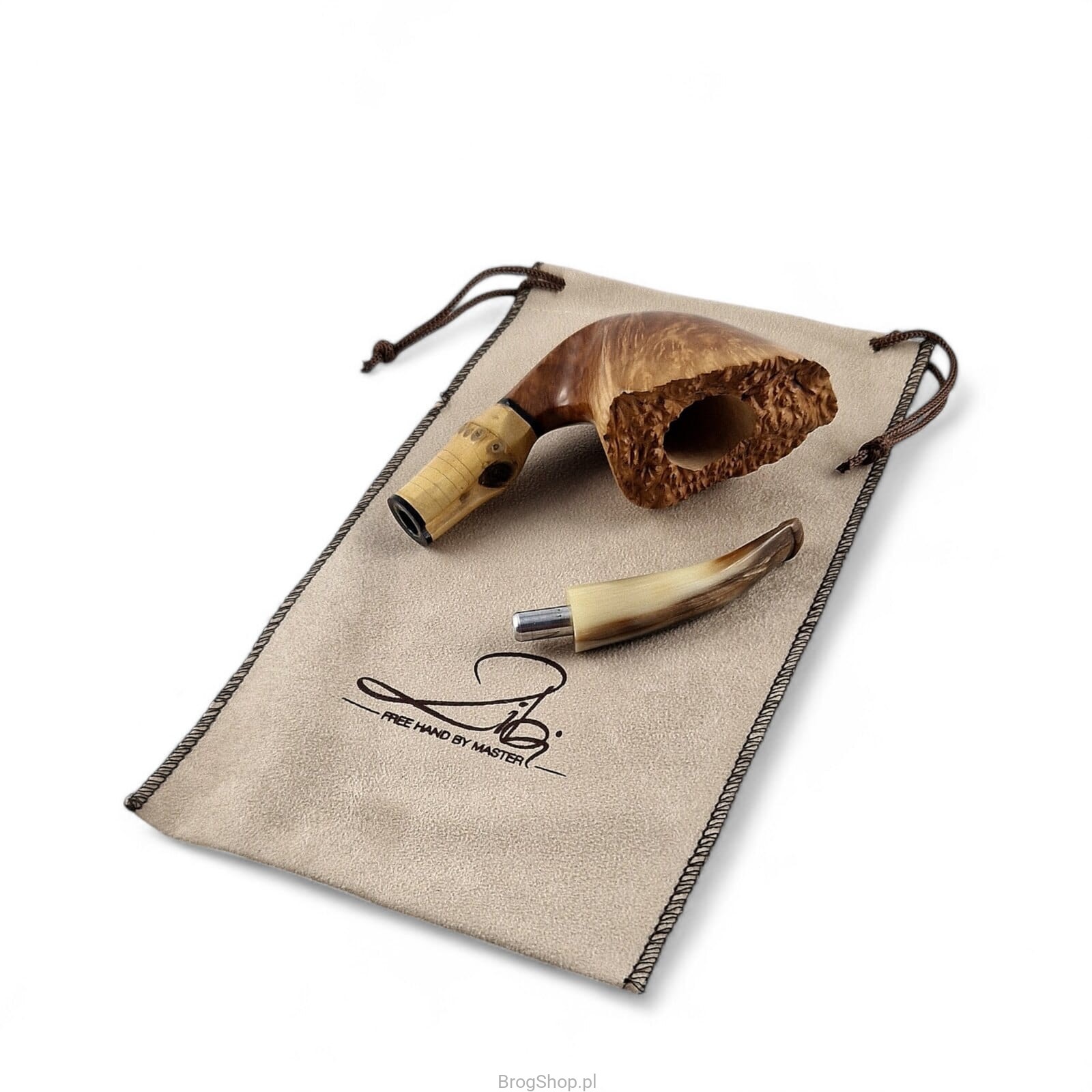 Freehand Zbigniewa Bednarczyka - fajka autorska mistrza fajkarskiego oraz właściciela przemyskiej pracowni Bróg Pipes. Ręcznie wykonana z wyraźnie usłojonego wrzośca Plateau, brak kitowań. Wykończona zewnętrznie olejem duńskim oraz twardym woskiem Carnauba, brak bejcowania oraz prekarbonizacji paleniska. Rim fajki naturalny, z widoczną wrzoścową korą. Szyjka fajki posiada wstawkę z naturalnego bambusa, pierścienie akrylowe. Ustnik powstał z prawdziwego rogu bawolego, czop aluminiowy. W zestawie materiałowy pokrowiec oraz eleganckie, dedykowane pudełko. Nieregularny kształt świetnie odzwierciedla sznyt twórcy, uformowanie główki wygodne dla osoby praworęcznej. Dostępna wyłącznie jedna sztuka widoczna na załączonych zdjęciach.