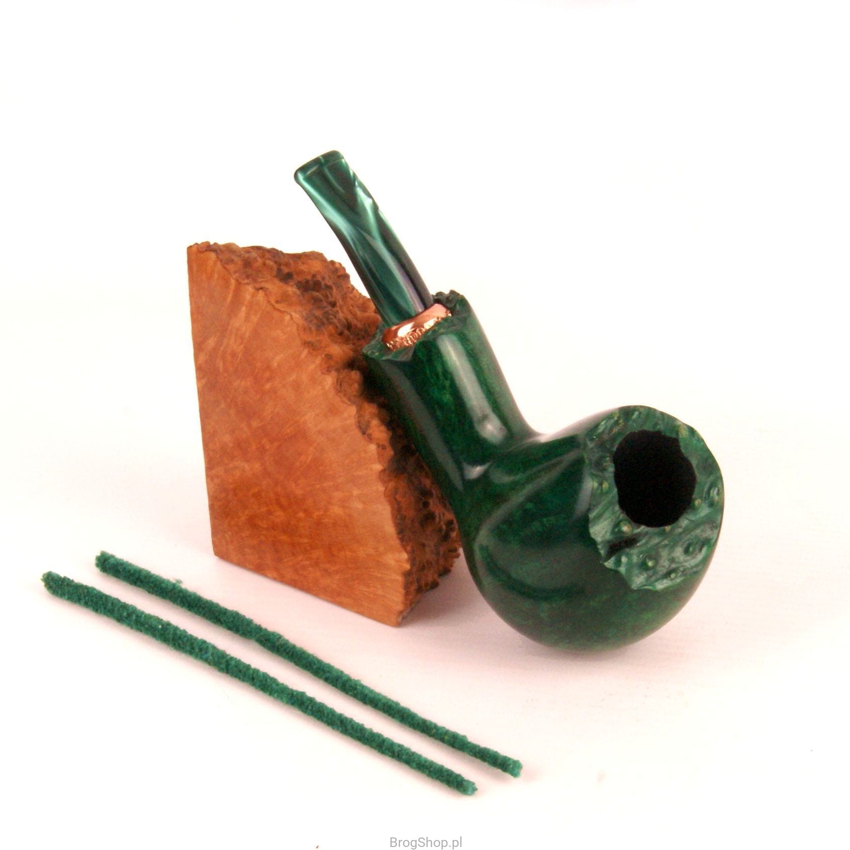 Fajka autorska Zbigniewa Bednarczyka właściciela pracowni Mr Bróg wykonana z włoskiego wrzośca Plateau (Romeo Domenico MIMMO). Palenisko prekarbonizowane, rim naturalny, ustnik akrylowy z filtrem 6 mm (40 mm dł.), pierścień ozdobny osadzony w szyjce fajki. Pokrowiec oraz eleganckie pudełko w zestawie.