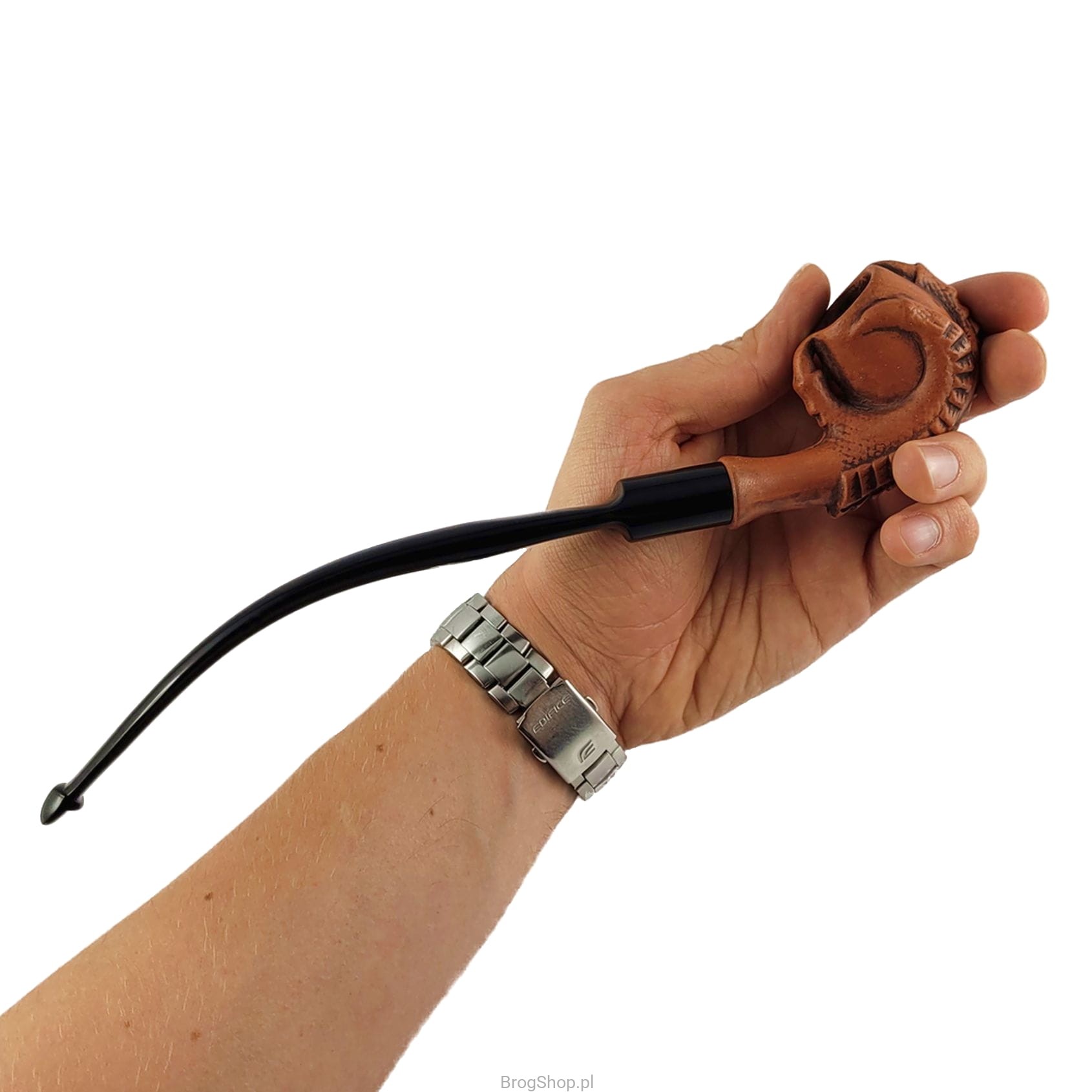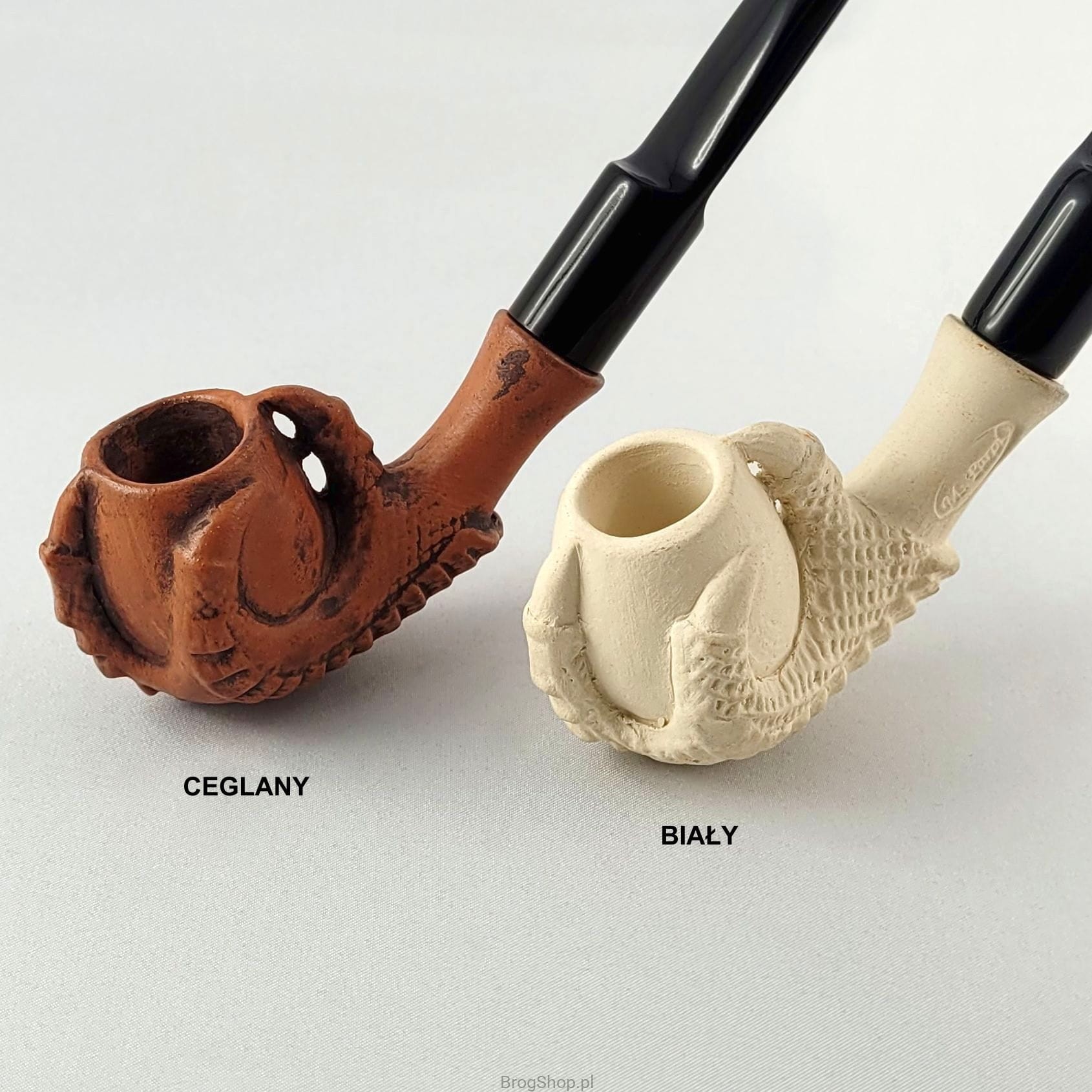 Wyjątkowa fajka gliniana przeznaczona do palenia tytoniu, wykonana przez Marka Parola według opracowanej technologii. Główka i palenisko fajki osadzone są między czterema szponami, to bardzo ciekawy i oryginalny wzór ceniony przez wielu fajczarzy. Długi ustnik z wytrzymałego ebonitu, wykonany i spasowany został w naszej pracowni. Materiał użyty do produkcji fajki, zapewni wyjątkowo chłodne i smaczne palenie. Jest to fajka kolekcjonerska nadająca się do palenia - wersja powiększona (wymiary poniżej), dostępna w zaledwie kilku egzemplarzach.