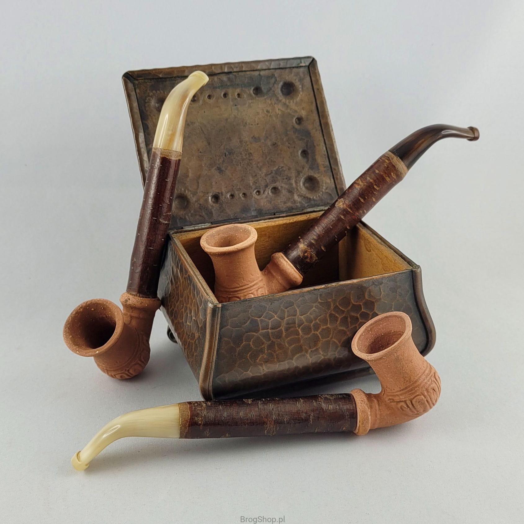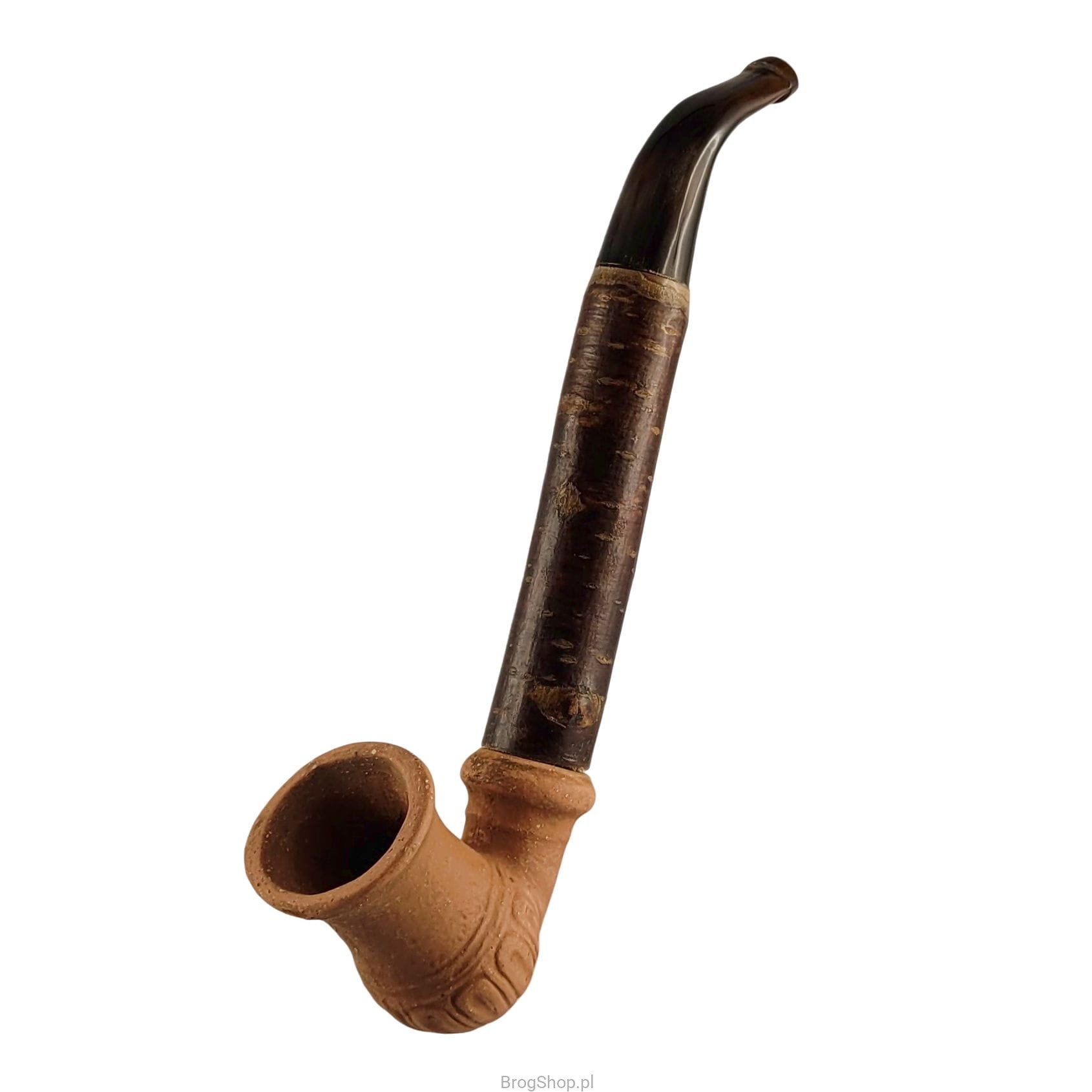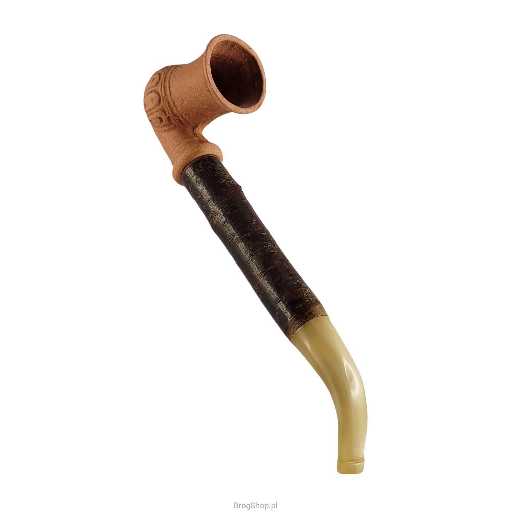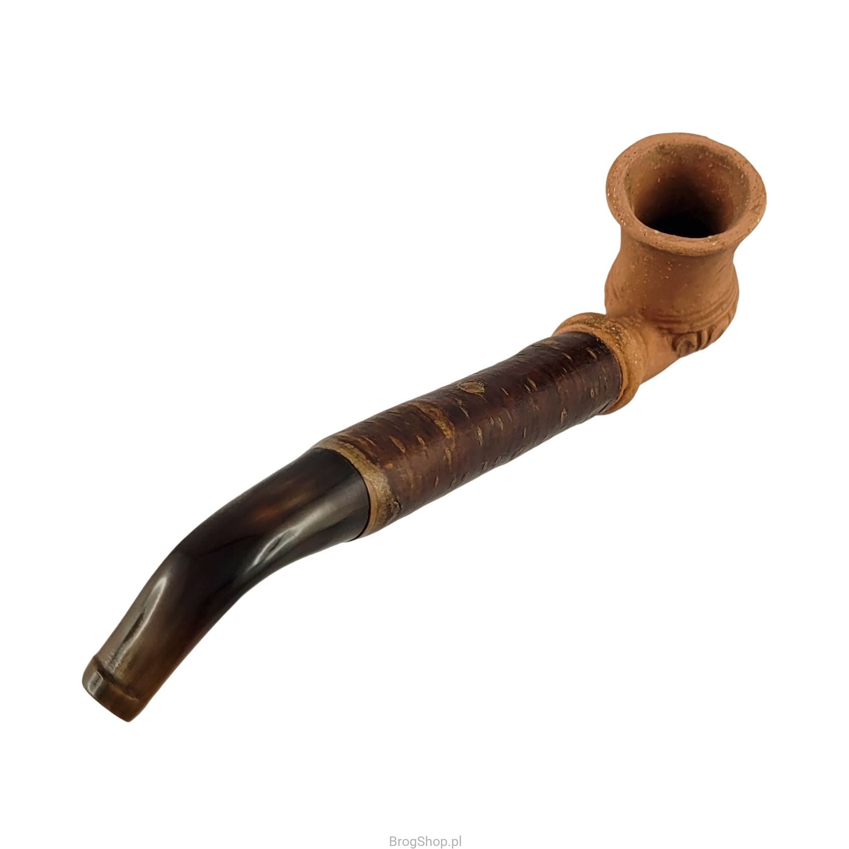 Oryginalna fajka gliniana do palenia tytoniu, wypalona w Przemyskiej Pracowni Marka Parola. Fajka dostępna jest wyłącznie w naszym sklepie w bardzo ograniczonej ilości - w chwili publikacji dostępne jedynie 3 sztuki. Zdobiona główka fajki posiada pojemne palenisko o zmiennej średnicy. Cybuch z drewna czereśni oraz ustnik z naturalnego, bawolego rogu zostały wykonane w naszej pracowni. Polecamy!
