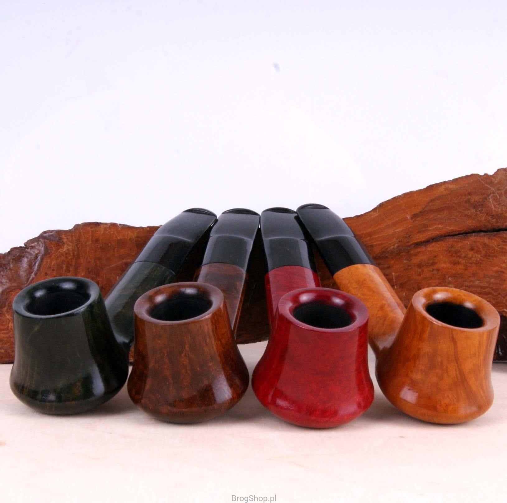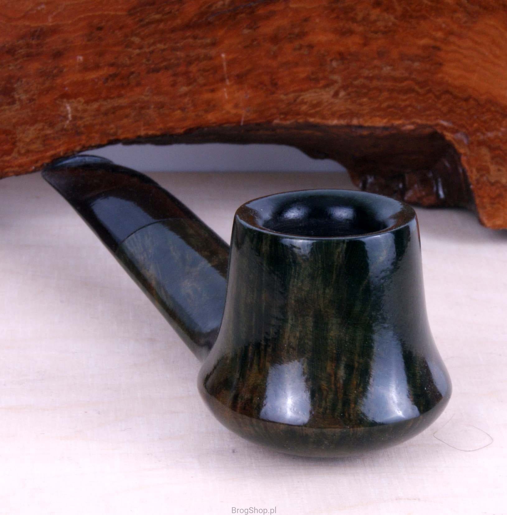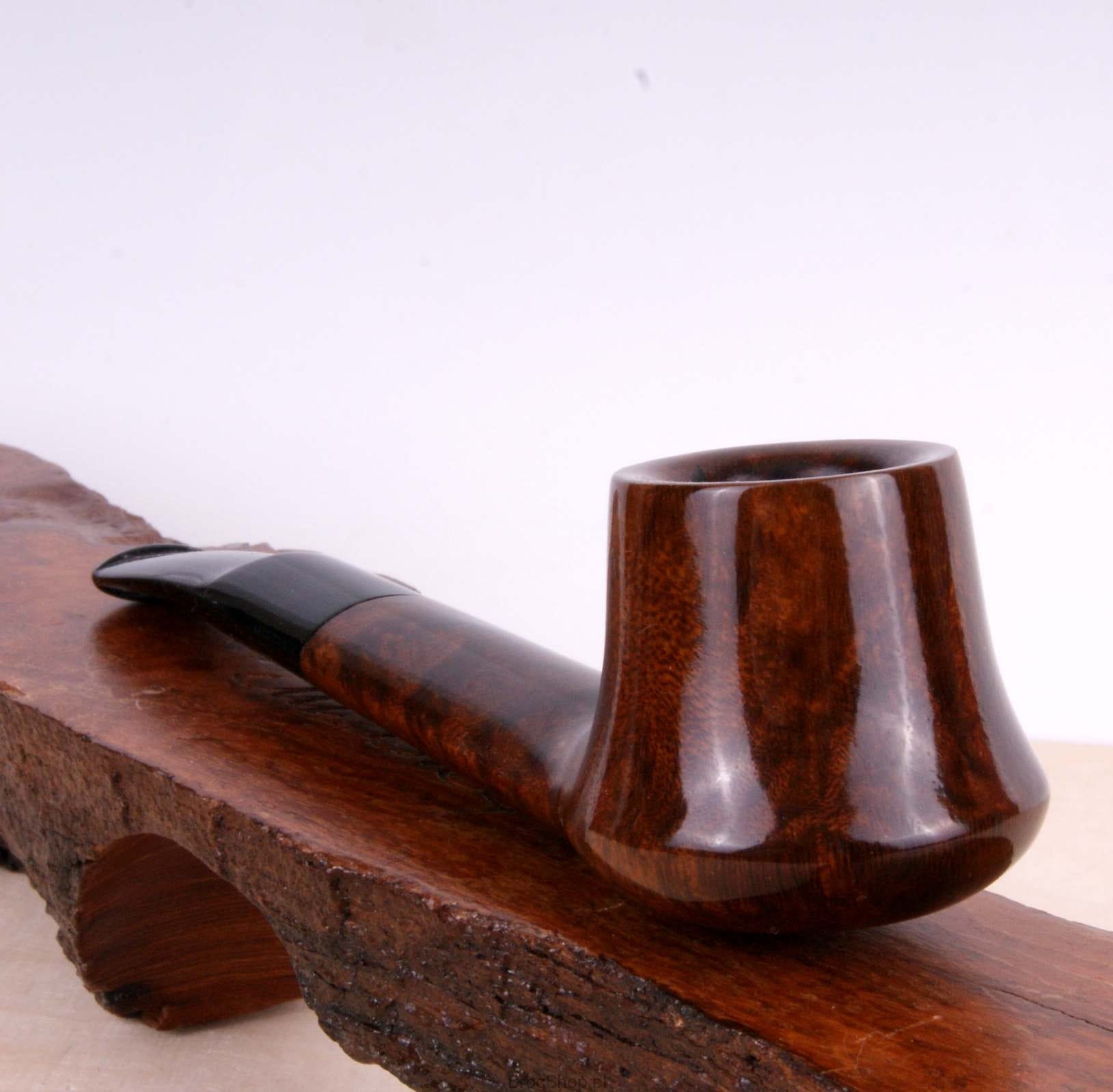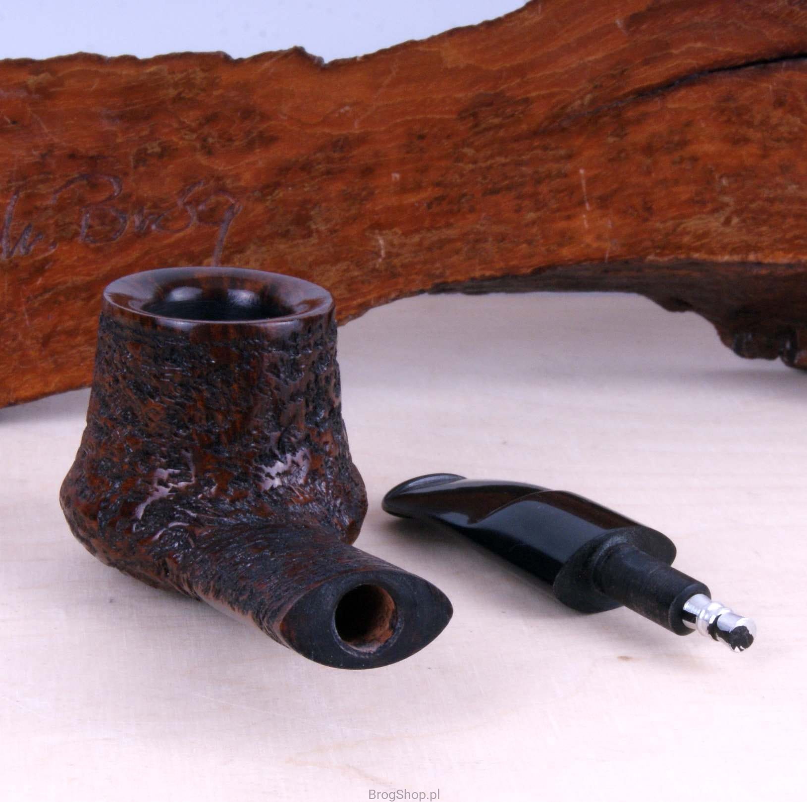 Interesująca i poręczna fajka, ręcznie wykonana z włoskiego wrzośca w naszej pracowni. Charakteryzuje się delikatnie wychyloną główką w kształcie Volcano oraz owalną, szeroką szyjką. Palenisko o standardowej pojemności, pokryte prekarbonizatem, wieńczy starannie wykończony rim. Ebonitowy ustnik został wyposażony w wyjmowany skraplacz, który skutecznie schładza dym przed dotarciem do ust. Fajka, zapakowana w pokrowiec oraz oryginalne pudełko Bróg Pipes, stanowi doskonały, elegancki prezent. Wrzosiec - Włochy/Toskania, Briar Cutter - Manno, klasa - Prima.
