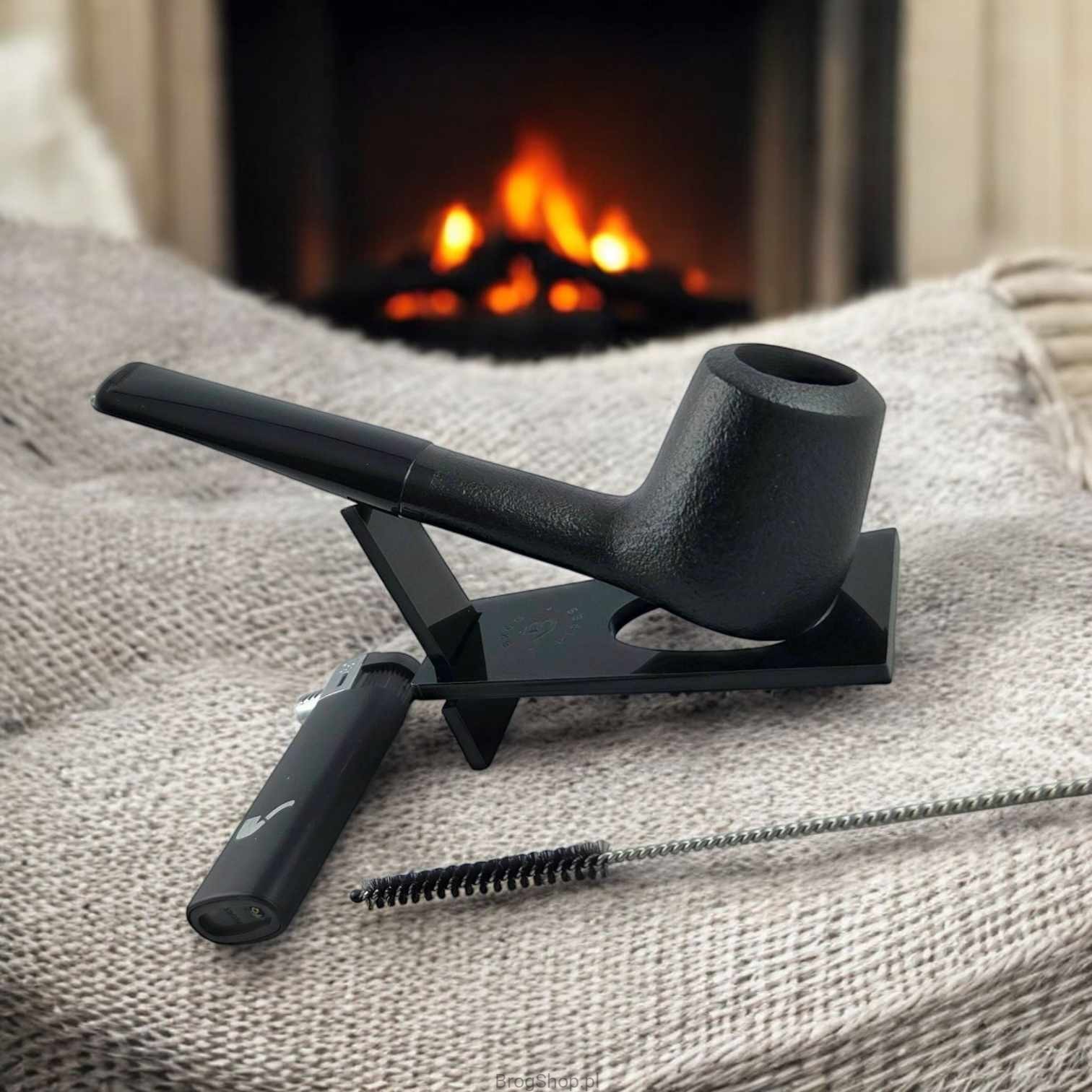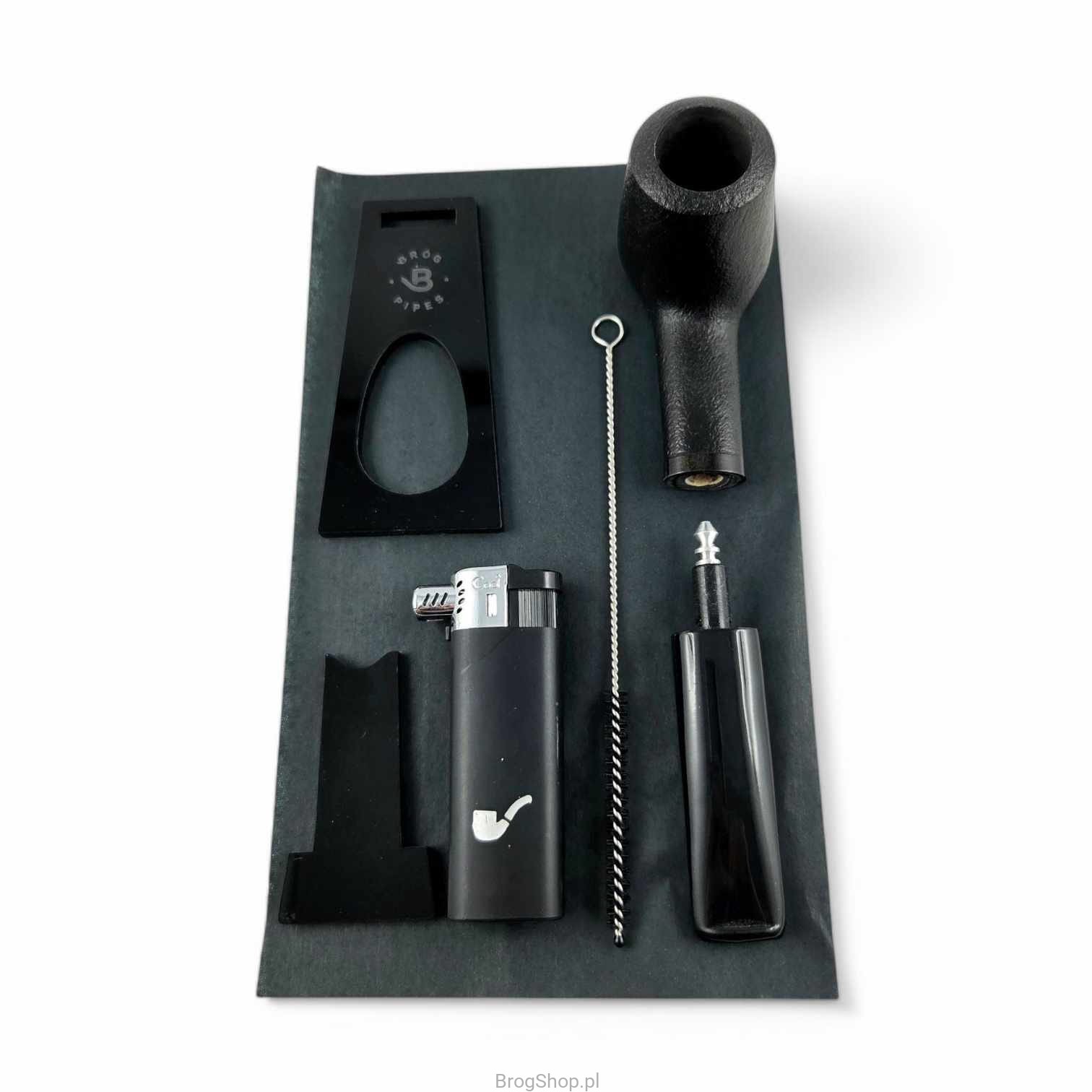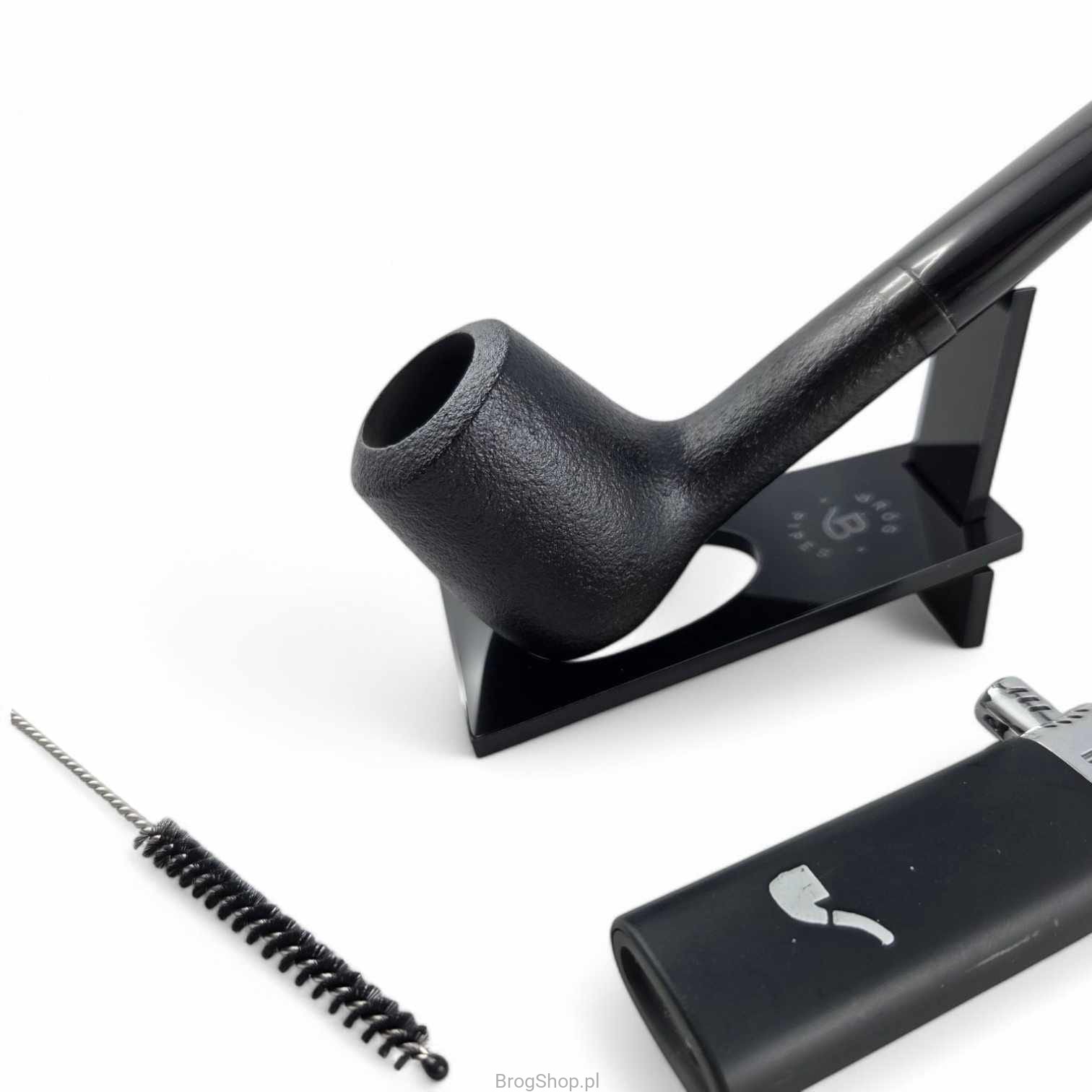 Zestaw zawierający piaskowaną fajkę, akrylowy stojak, zapalniczkę fajkową oraz sztywny wycior.