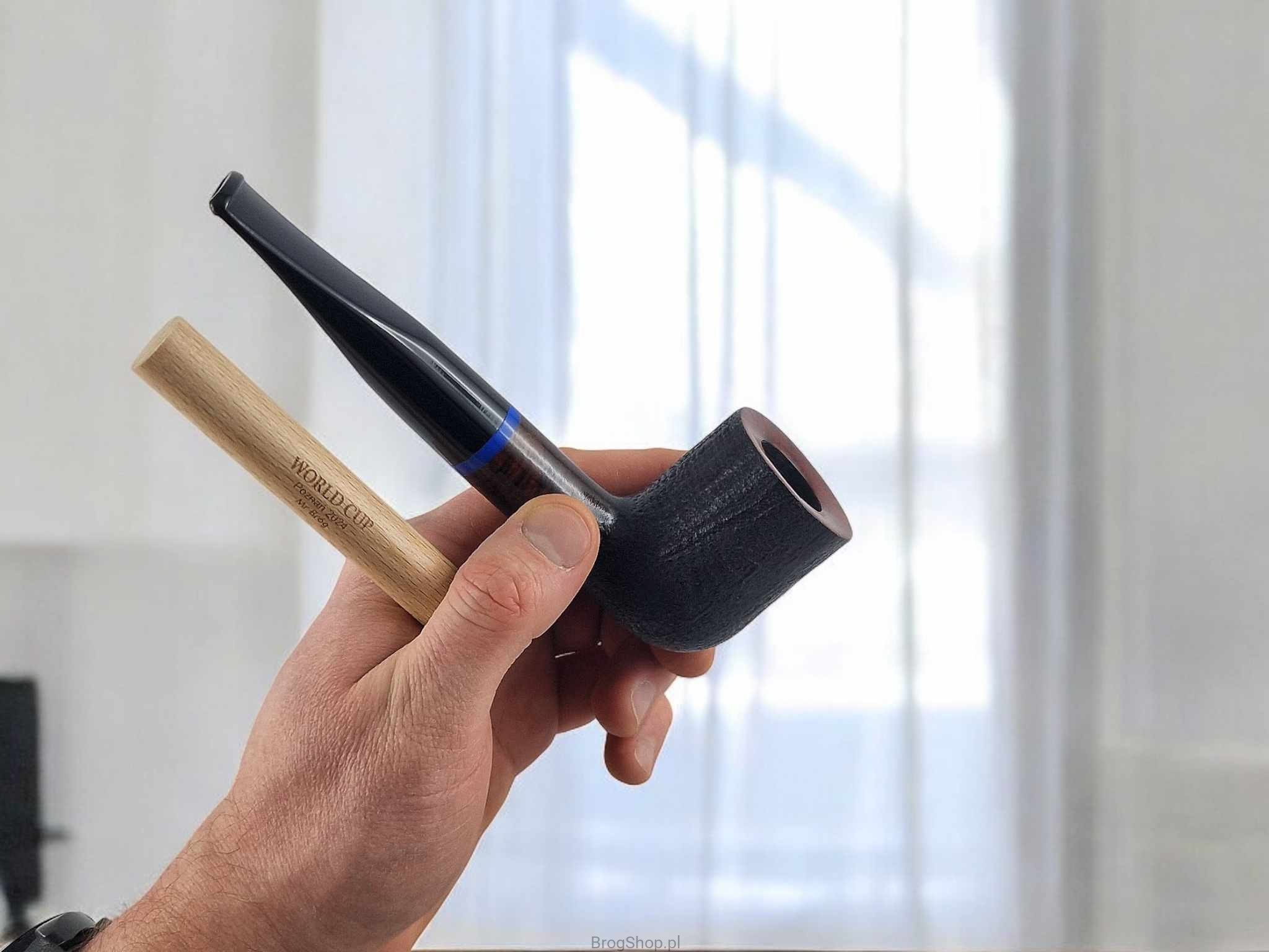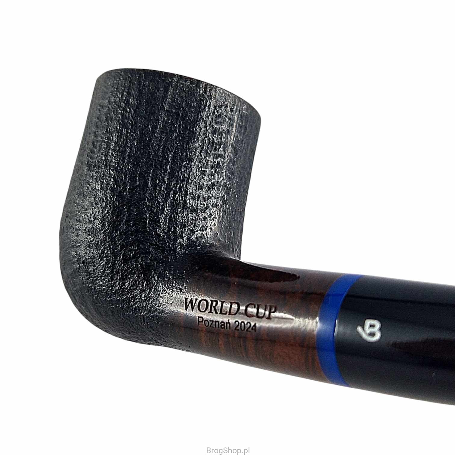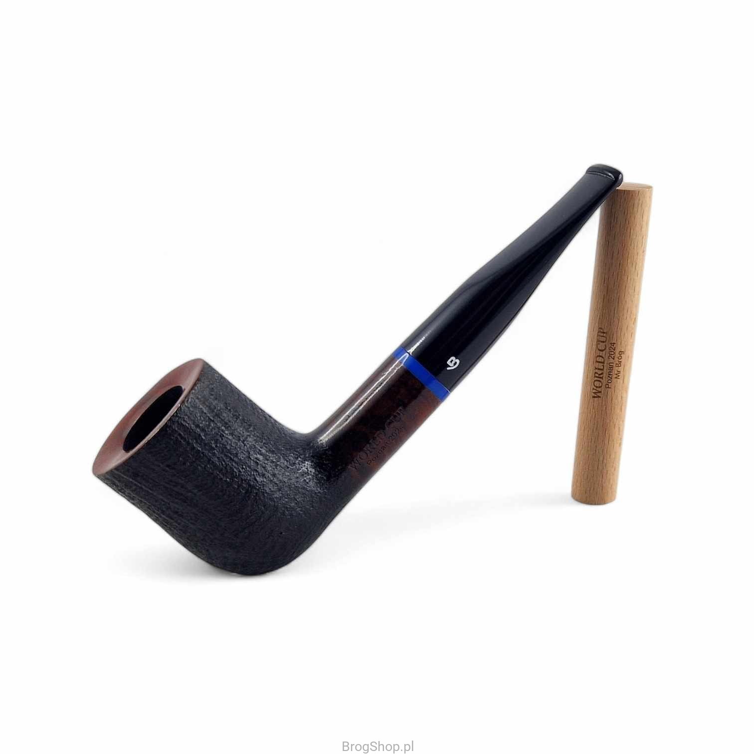 Fajka turniejowa, wykonana ręcznie z włoskiego wrzośca (Mimmo - Liguria). Klasyczny kształt fajki typu Billiard, stworzony zgodnie z projektem zatwierdzonym przez organizatorów specjalnie na tę okazję. Główkę fajki wypiaskowaliśmy, natomiast rim oraz szyjkę pozostawiliśmy gładkie. Pierścień w kolorze niebieskim wykonaliśmy z akrylu, podobnie jak wytrzymały ustnik. Czop z teflonu przystosowany do filtra 9 mm wyposażony jest w reduktor 3 mm. Palenisko prekarbonizowane. Fajka zapakowana jest w materiałowy pokrowiec oraz eleganckie pudełko prezentowe. Zachęcamy do zapoznania się z obszerną galerią zdjęć zarówno fajki, jak i samego wydarzenia. Polecamy—liczba egzemplarzy jest mocno ograniczona.