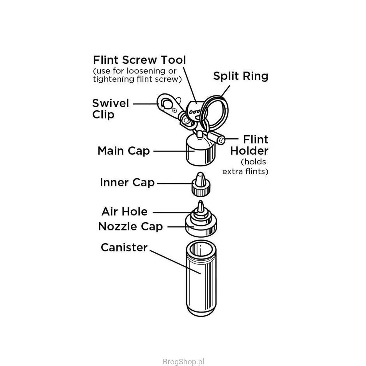 Wyposażony jest w obrotowy karabińczyk, kółko do kluczy, dysk do odkręcania i dokręcania śruby krzesiwa oraz gumową tulejkę do przechowywania dwóch dodatkowych krzesiw Zippo.