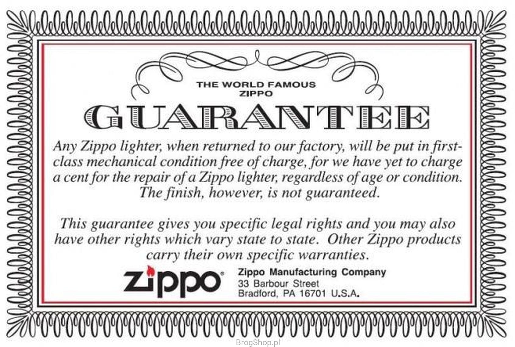 * "Zapalniczki benzynowe Zippo posiadają wieczystą gwarancję producenta na działanie. Oznacza to, że każda oryginalna zapalniczka jest naprawiana przez Zippo za darmo. Nie są wymagane ani karta gwarancyjna, ani paragon z kasy fiskalnej. Wystarczy jeśli oryginalny produkt zostanie wysłany na następujący adres: